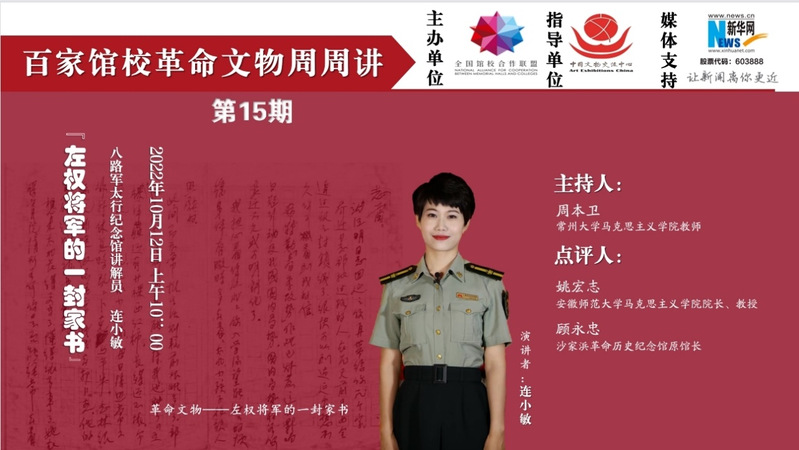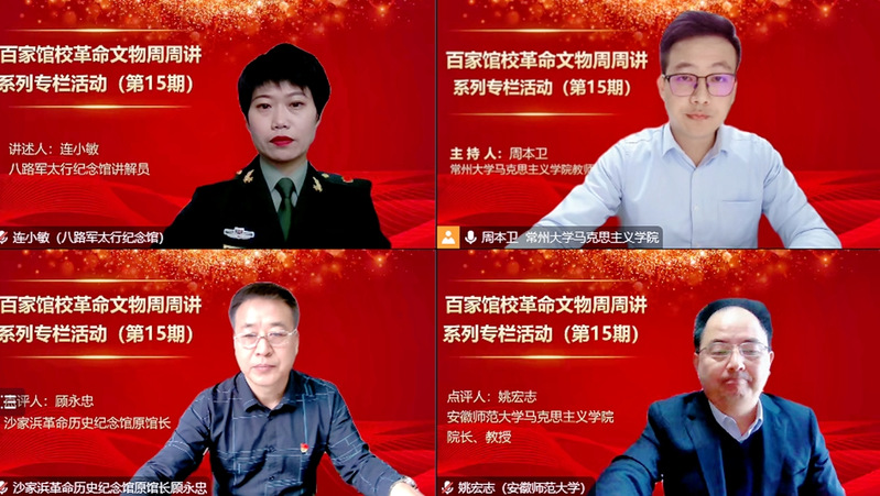 10月12日,为推动用好用活革命文物工作,由全国馆校合作联盟主办,中国文物交流中心指导,常州大学马克思主义学院、常州大学近现代史与红色文化研究院联袂推出“百家馆校革命文物周周讲”系列专栏第15期网络课程活动。本期邀请八路军太行纪念馆优秀讲解员,曾荣获文化和旅游部“全国五好讲解员”、首届全国红色故事大赛二等奖、山西省金牌讲解员的连小敏担任讲述人,安徽师范大学马克思主义学院院长姚宏志和沙家浜革命历史纪念馆原馆长顾永忠担任点评嘉宾。来自全国馆校合作联盟理事单位的常州大学、 安徽师范大学、八路军太行纪念馆等高校部分师生及博物馆人,通过线上方式参加活动。