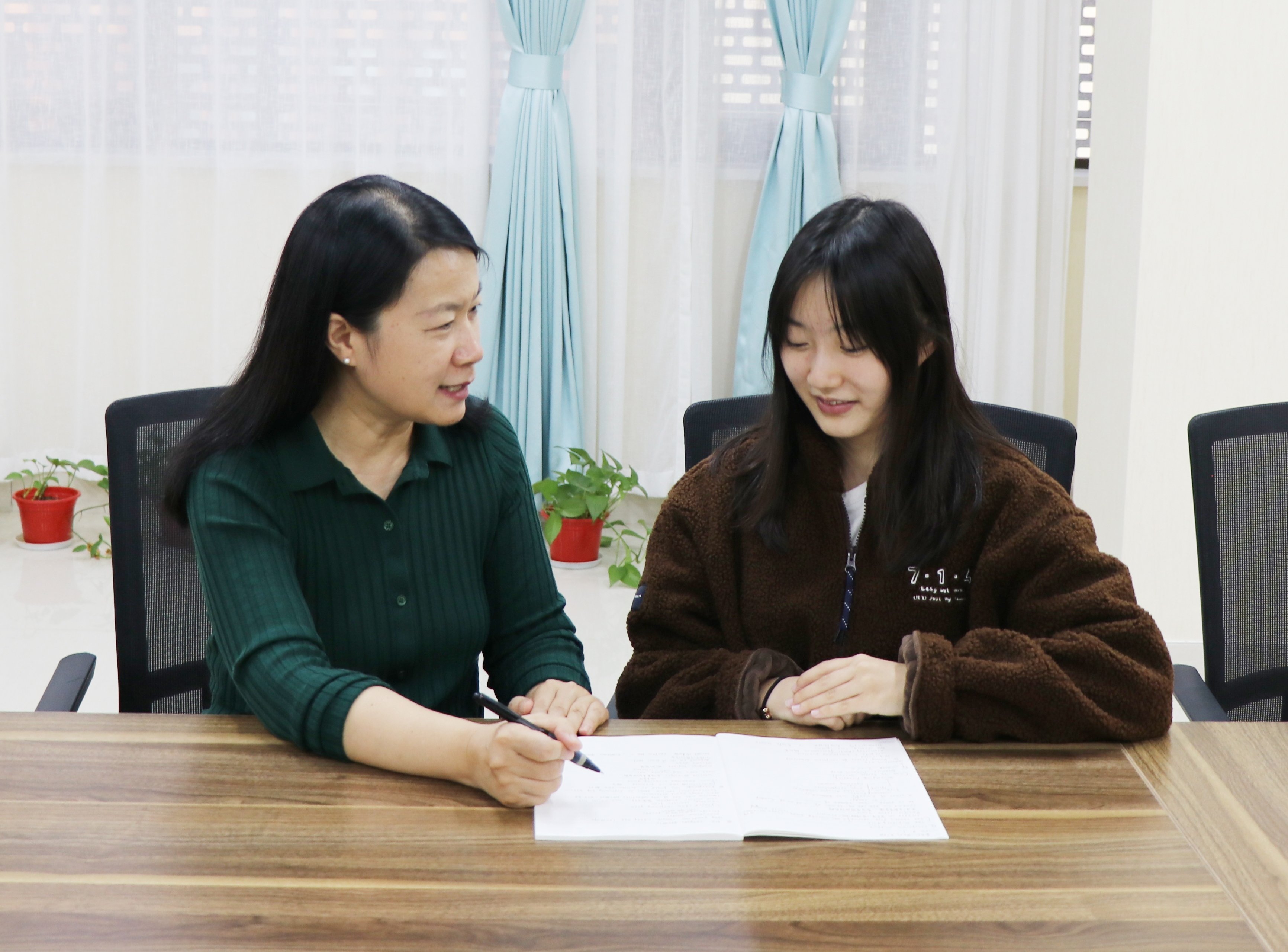 陈颖老师(左)指导何映瑾同学(右)备赛