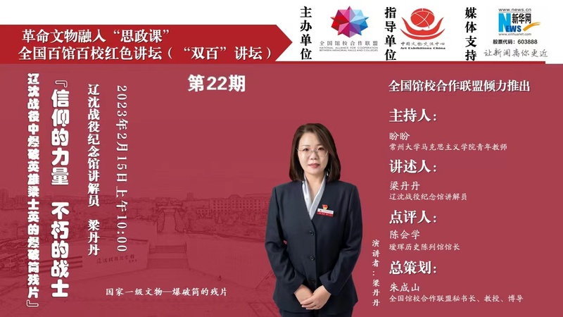 2月15日,为推动用好用活革命文物工作,由全国馆校合作联盟主办,中国文物交流中心指导,常州大学马克思主义学院、常州大学近现代史与红色文化研究院联袂推出“革命文物融入‘思政课’全国百馆百校红色讲坛”(简称“‘双百’讲坛”)第22期网络课程活动。本期邀请辽沈战役纪念馆讲解员、特等功臣梁士英的孙女梁丹丹担任讲述人,瑷珲历史陈列馆馆长陈会学担任点评人。来自全国馆校合作联盟理事单位的常州大学、辽沈战役纪念馆、瑷珲历史陈列馆等高校部分师生及博物馆人,通过线上方式参加了活动。该活动由全国馆校合作联盟秘书长朱成山教授总策划和总撰稿,常州大学青年教师董盼盼主持。
