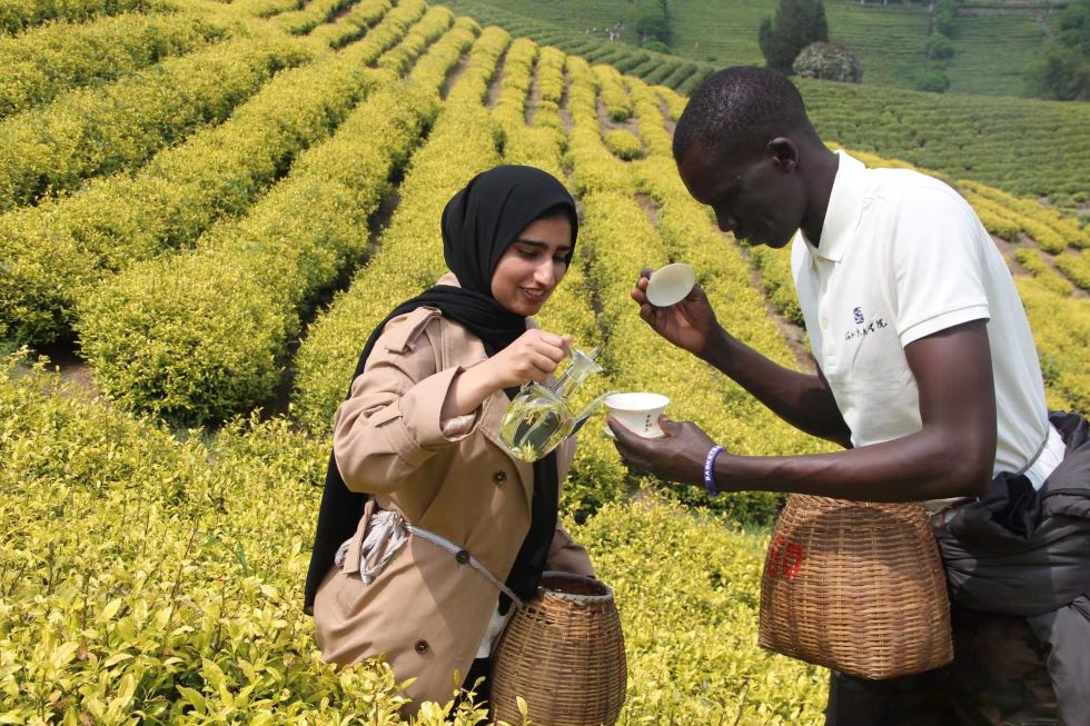 “我们要采摘的是牙尖的茶叶,像这样用指腹轻轻折下,不能用指甲掐,不然会影响茶的品质。”在正式采摘前,中外大学生志愿者们在茶农的现场示范和讲解下,很快掌握了采茶要领,逐渐进入了茶农劳作的角色.他们身着红马甲穿梭于茶树之间,为这片绿意盎然的生态茶园增添了一道靓丽的风景线。
