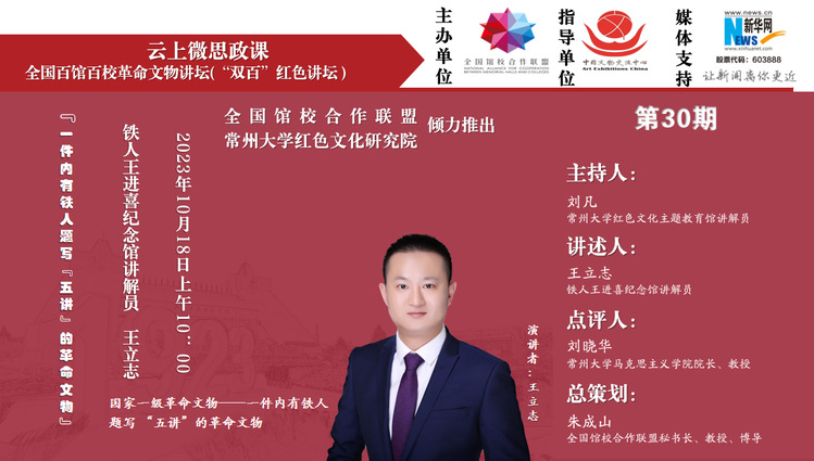 10月18日,为推动用好用活革命文物工作,由全国馆校合作联盟主办,中国文物交流中心指导,常州大学马克思主义学院、常州大学红色文化研究院联袂推出“云上微思政课——全国百馆百校革命文物讲坛”(简称“百馆百校红色讲坛”)第30期网络课程活动。本期邀请铁人王进喜纪念馆讲解员王立志担任讲述人,常州大学马克思主义学院院长刘晓华担任点评人。来自全国馆校合作联盟理事单位的常州大学、铁人王进喜纪念馆、雷锋纪念馆、孔繁森同志纪念馆、博山焦裕禄纪念馆等高校部分师生及博物馆人,通过线上的方式参加活动。该活动由全国馆校合作联盟秘书长朱成山教授担任总策划和总撰稿。