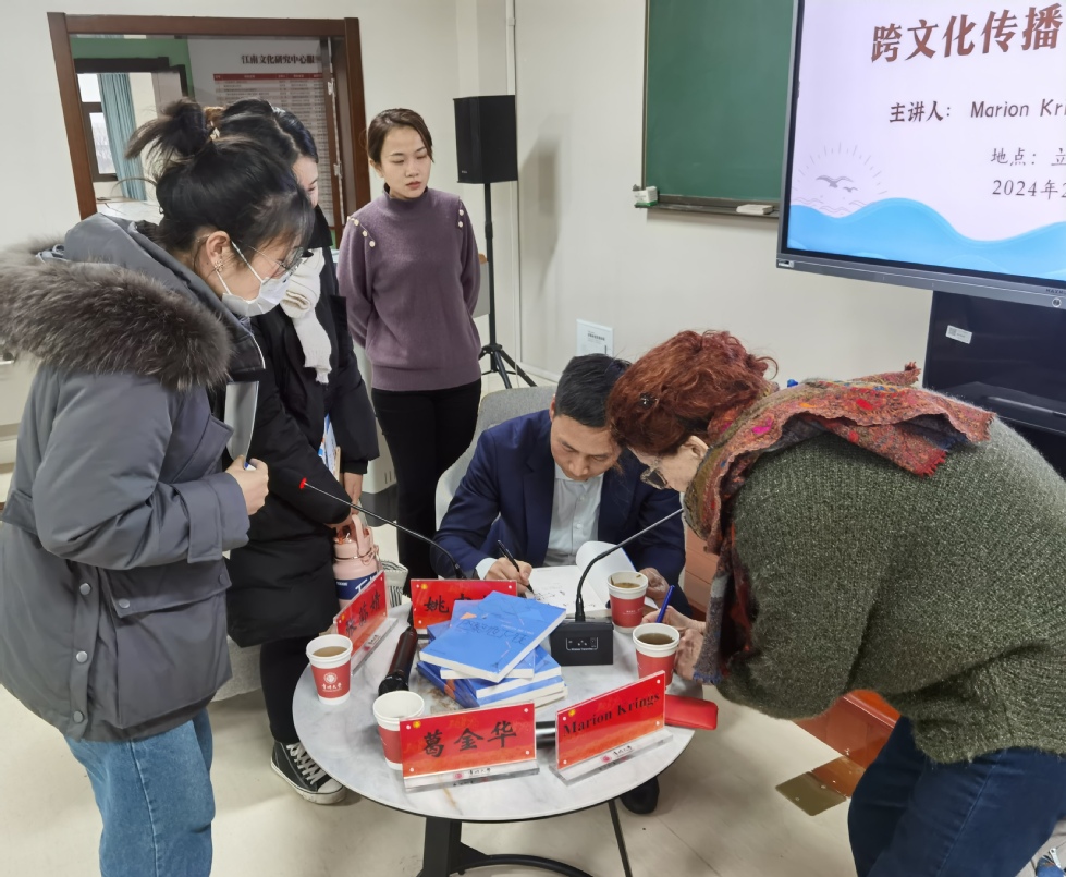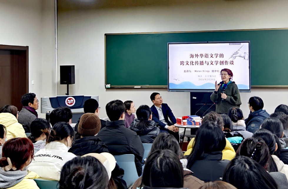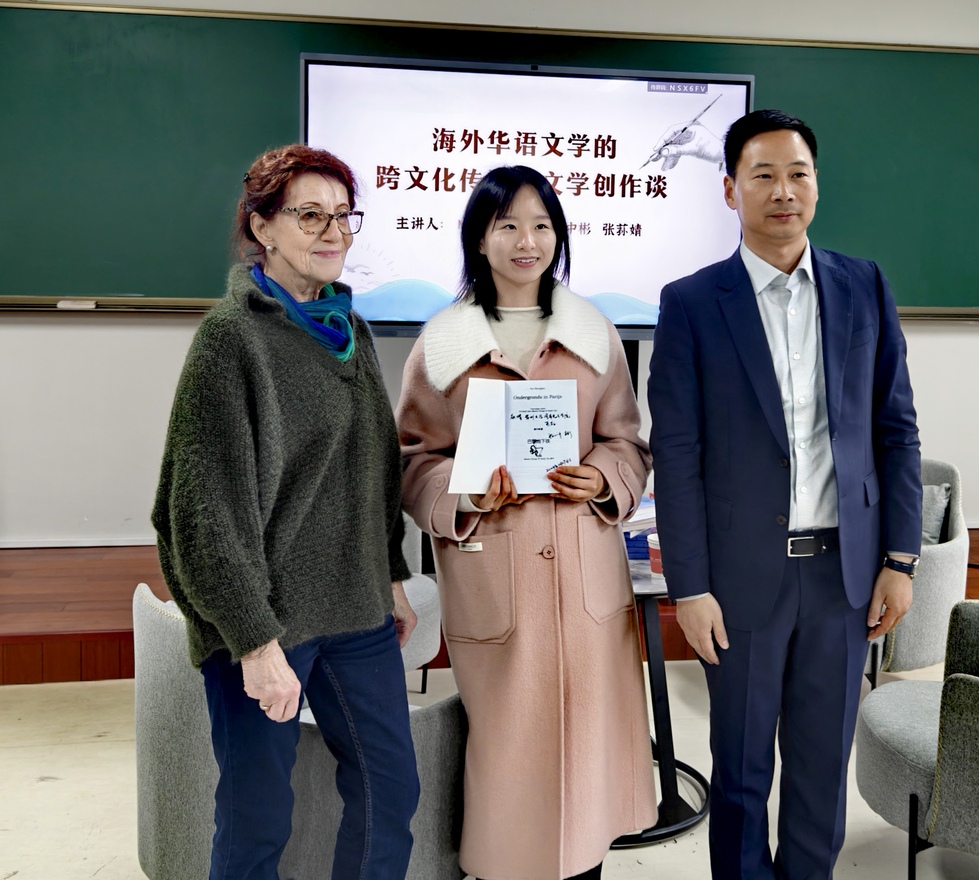 2月29日,周有光文学院、跨文化研究院在西太湖校区立言楼342文化教室联合举办“海外华语文学的跨文化传播与文学研讨会”。法国著名翻译家、作家、荷兰鹿特丹大学博士玛瑞安(Marion Krings),《巴黎地下铁》小说作者、常州籍作家姚中彬,以及南京籍翻译家、作家张荪婧应邀与我校师生分享了文学创作、翻译和传播的故事与经验。跨文化研究院院长杜志峰参会,周有光文学院院长葛金华主持研讨会。