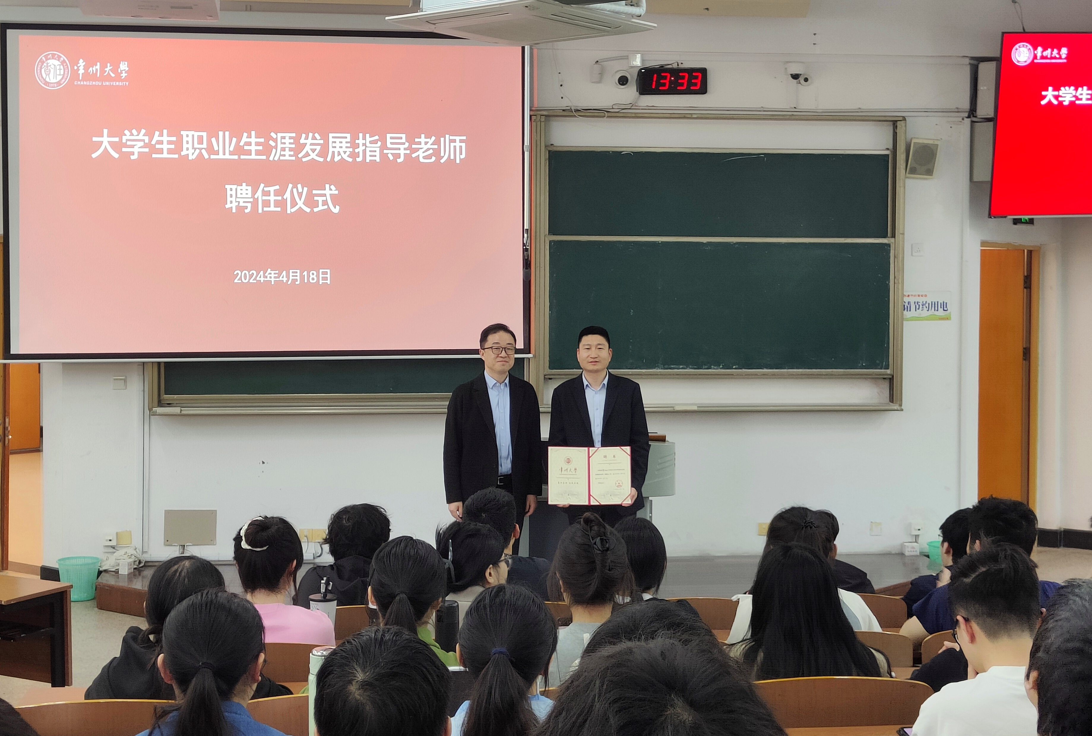 交流会后,周刚为曹其林颁发“大学生职业生涯发展指导老师”聘书,曹其林为机械学院学生开展“求职准备及择业定位”生涯指导讲座。(通讯员/阴祥 审核/蒋琳 编辑/庄媛)