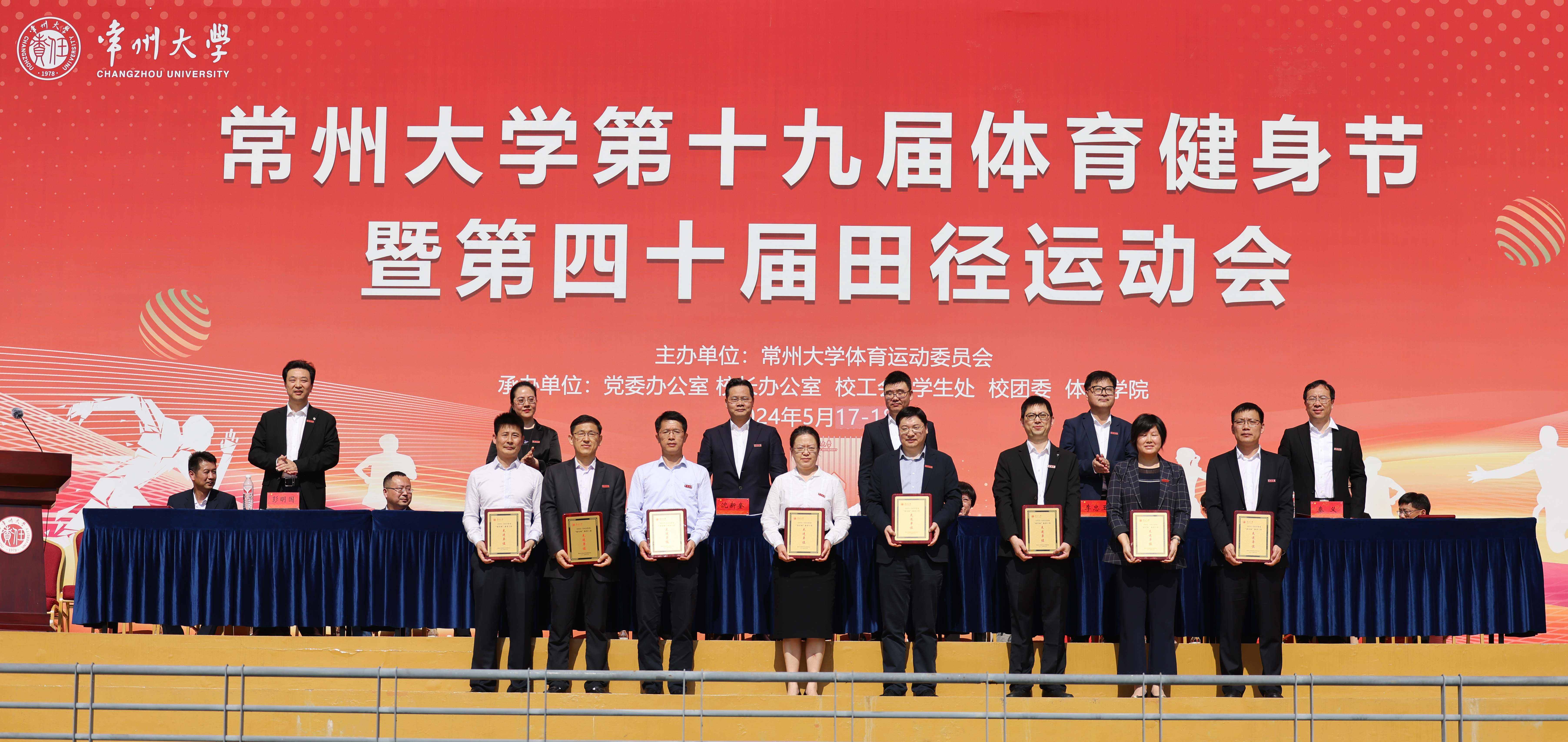 王建浦宣读《常州大学2022-2023学年“校长杯”体育工作先进单位》《常州大学2023年度学生体质健康测试先进单位》的表彰文件,校领导分别为获奖单位颁奖。