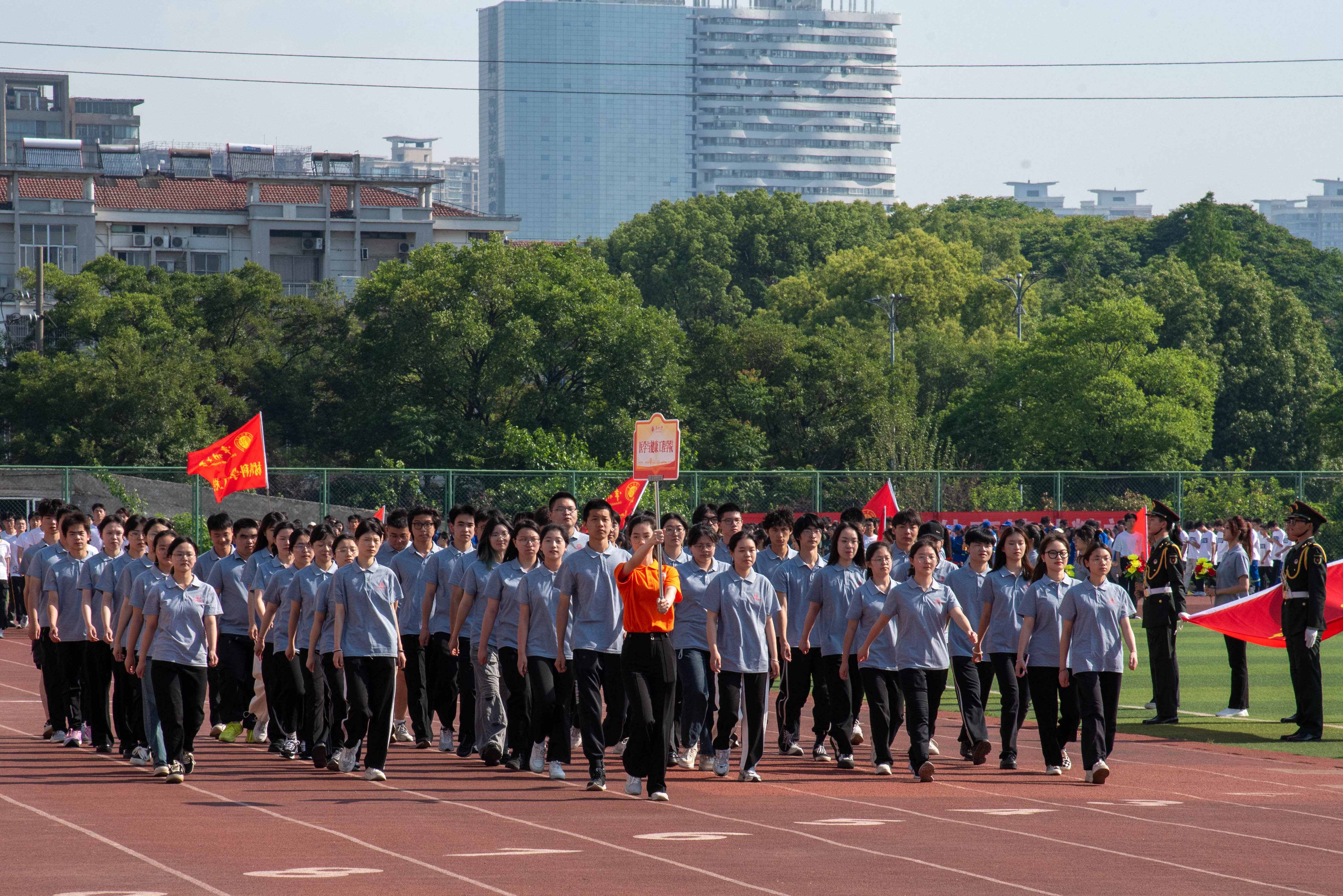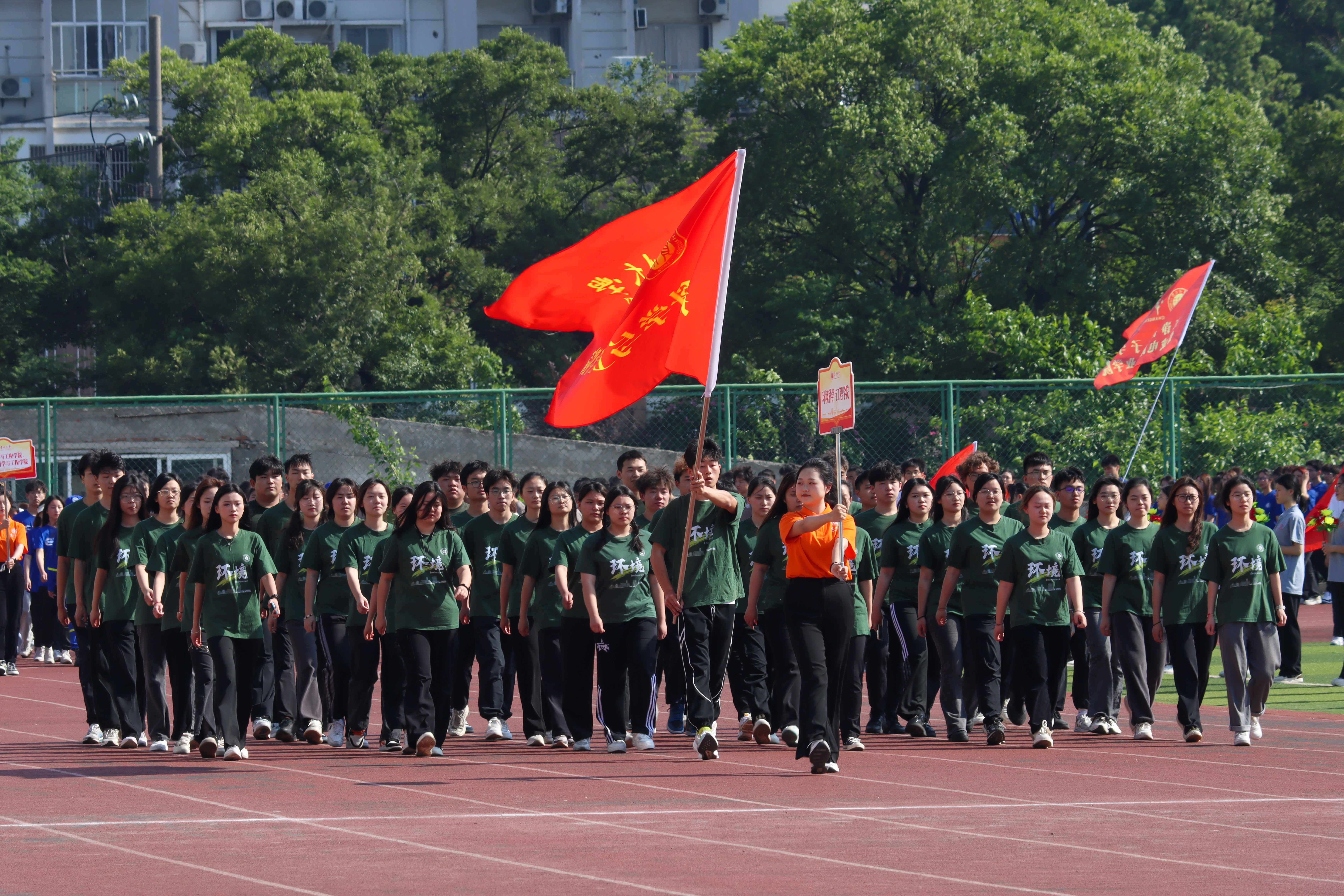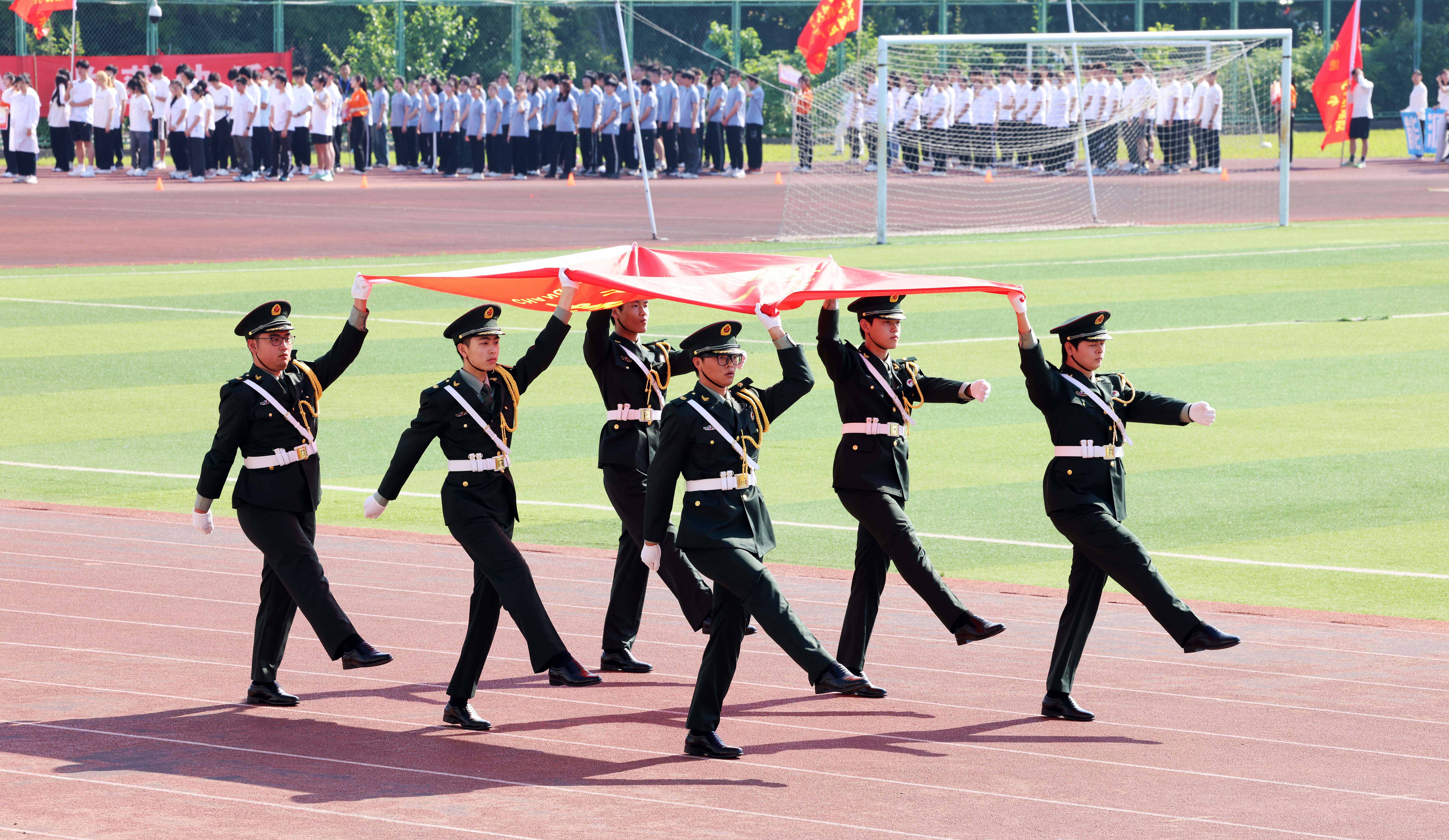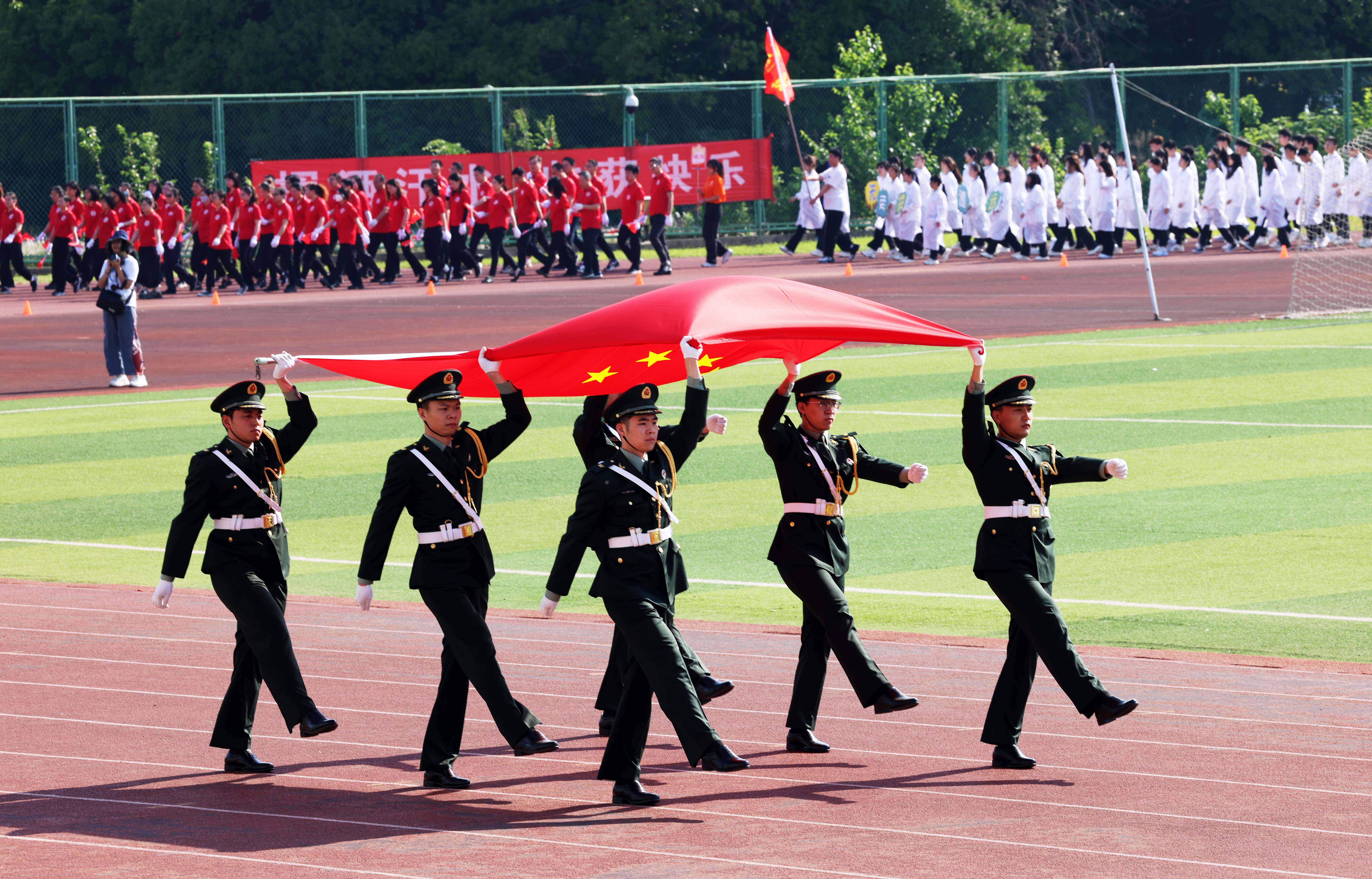 伴随着激昂的运动员进行曲,国旗、校旗、彩旗、鲜花、裁判员、运动员等各个方队迈着有力的步伐,喊着响亮的口号,以饱满的精神状态依次通过主席台。随后,在庄严的国歌声中,全体人员面向国旗,行注目礼,唱中华人民共和国国歌,举行升国旗仪式。