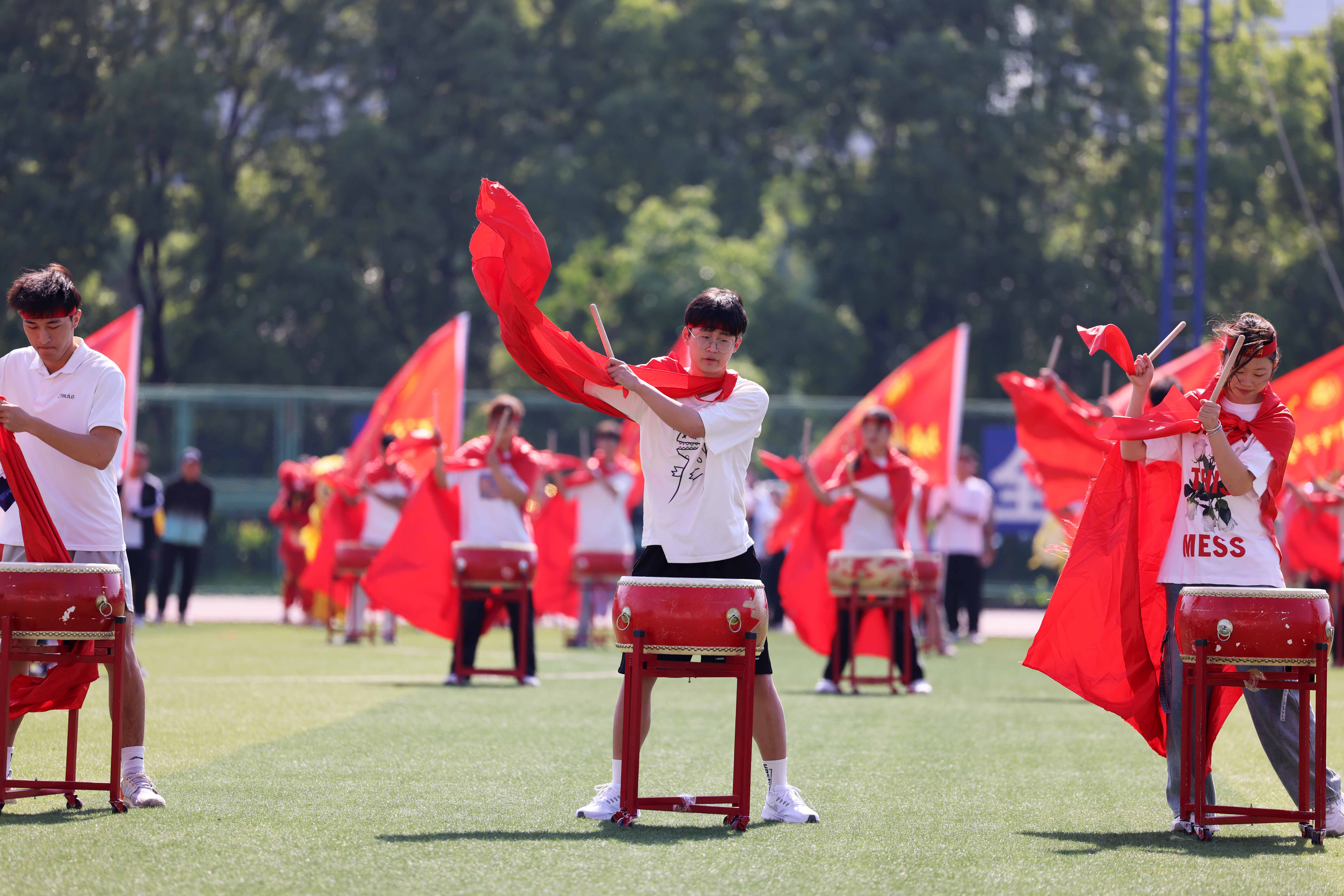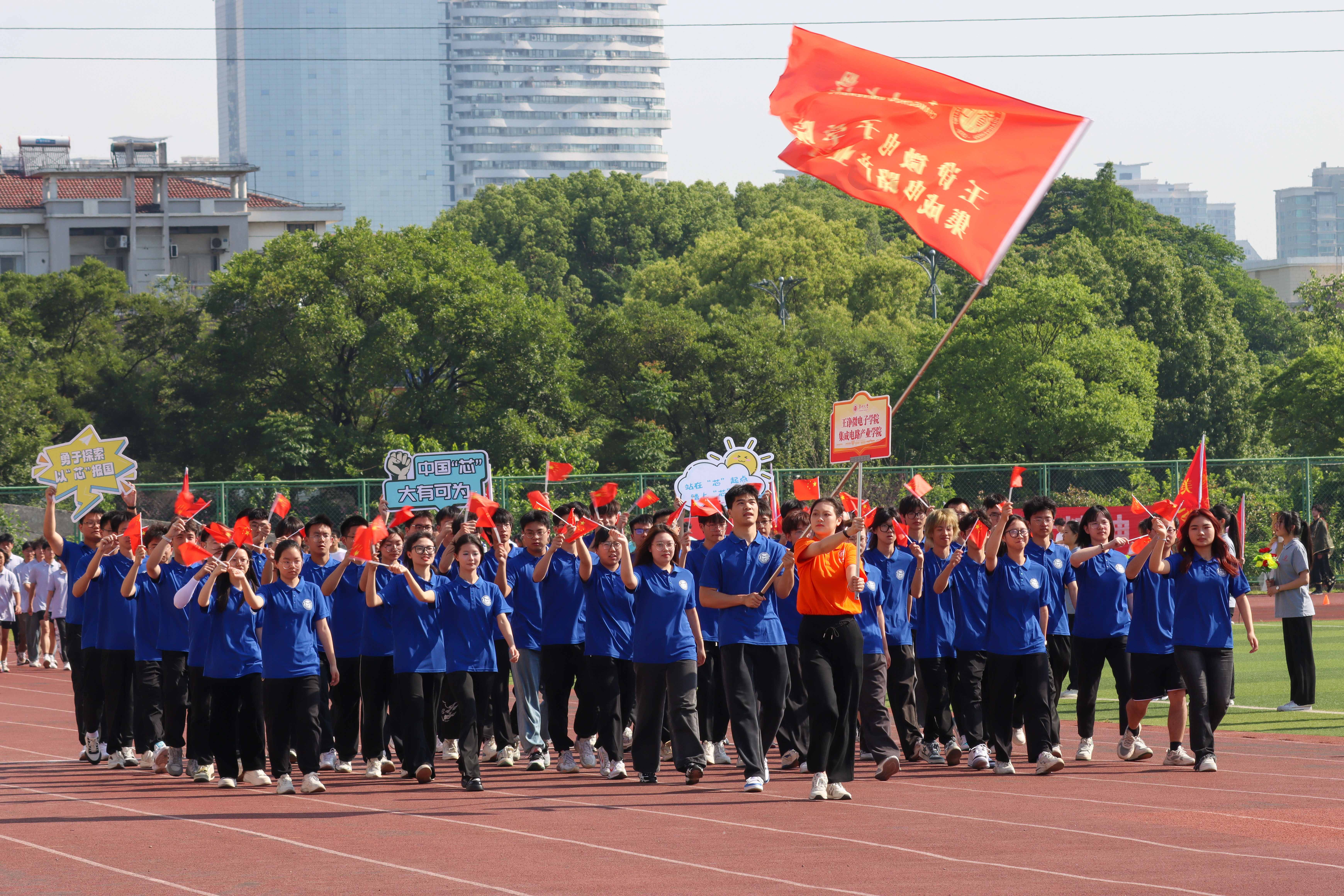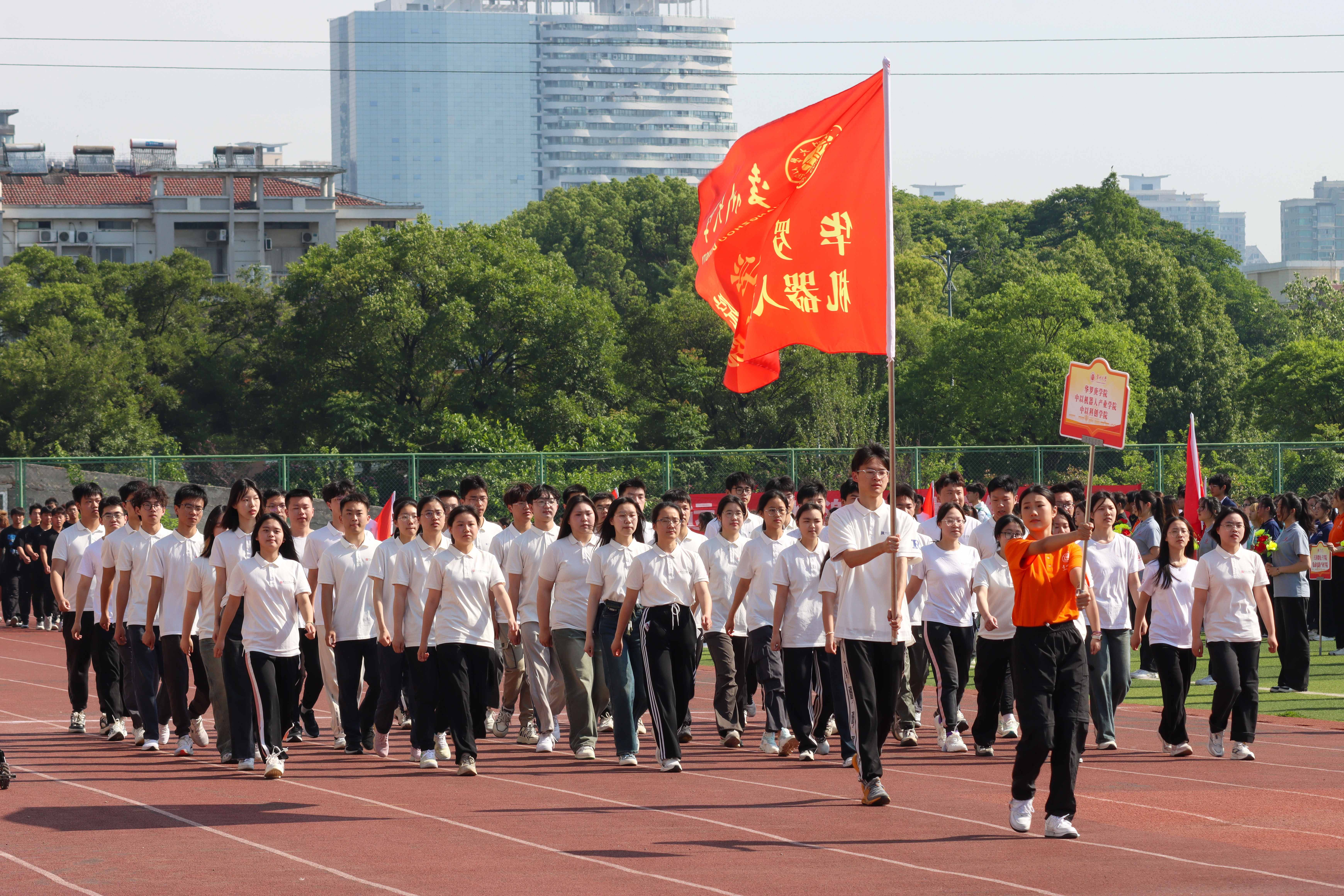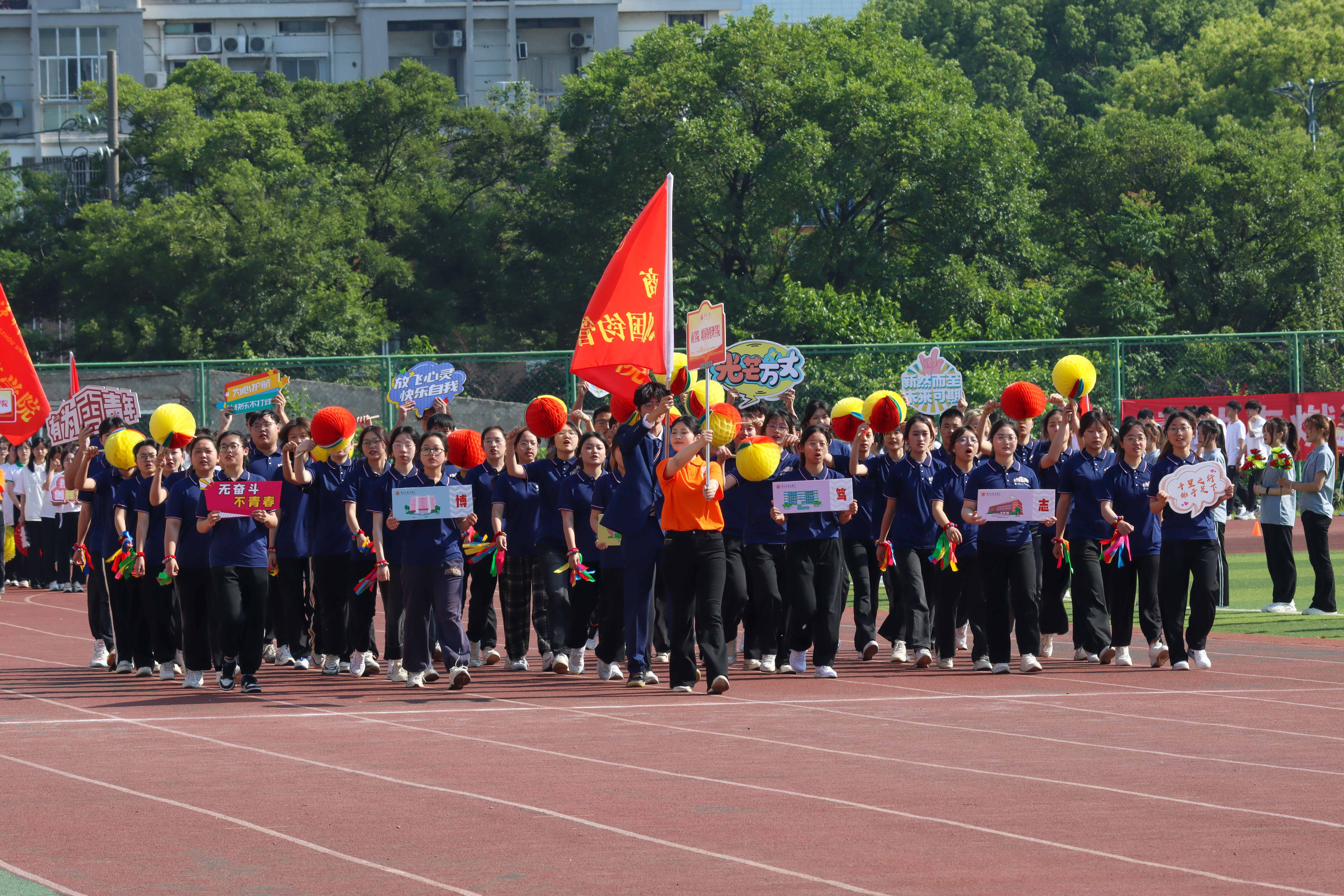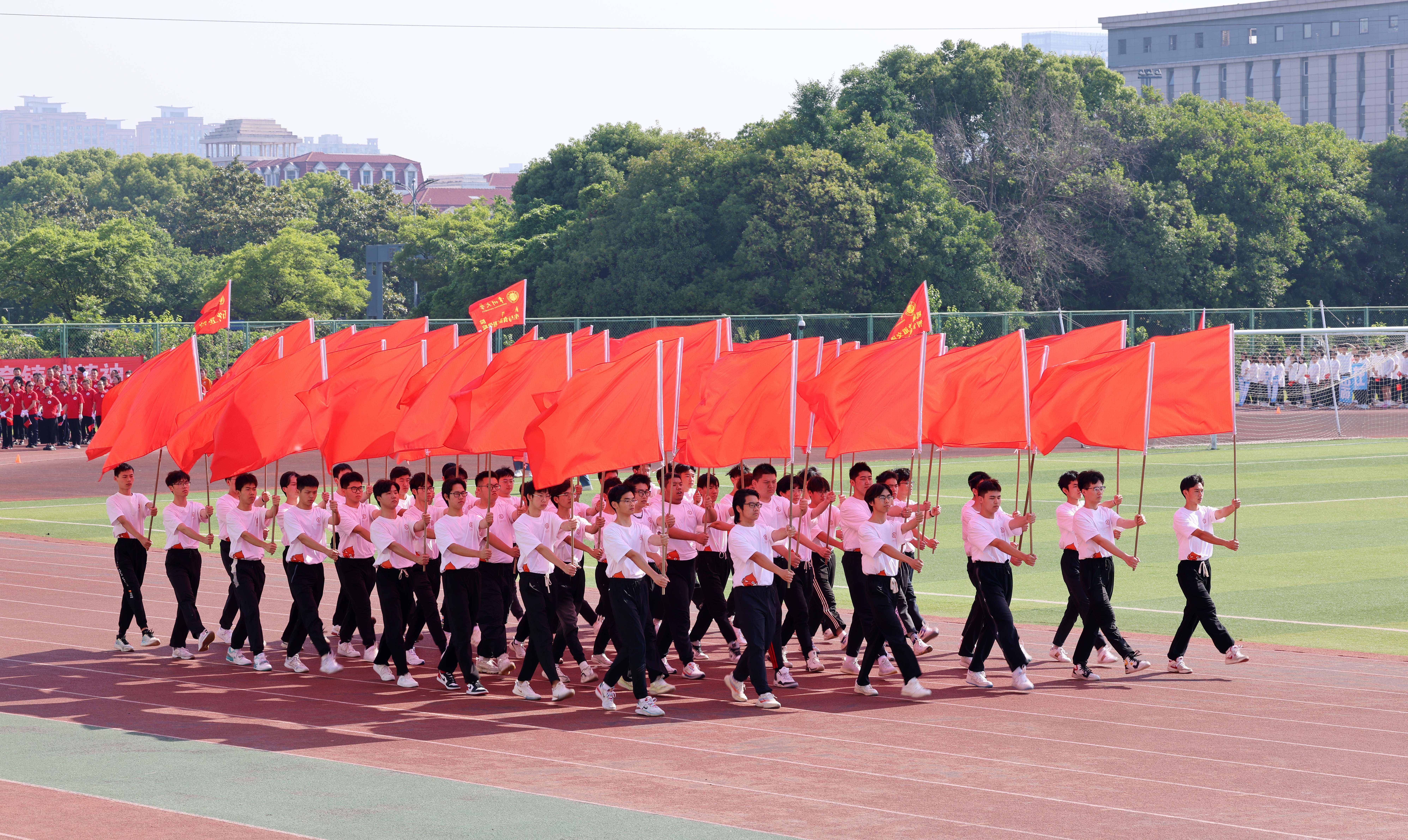 伴随着激昂的运动员进行曲,国旗、校旗、彩旗、鲜花、裁判员、运动员等各个方队迈着有力的步伐,喊着响亮的口号,以饱满的精神状态依次通过主席台。随后,在庄严的国歌声中,全体人员面向国旗,行注目礼,唱中华人民共和国国歌,举行升国旗仪式。