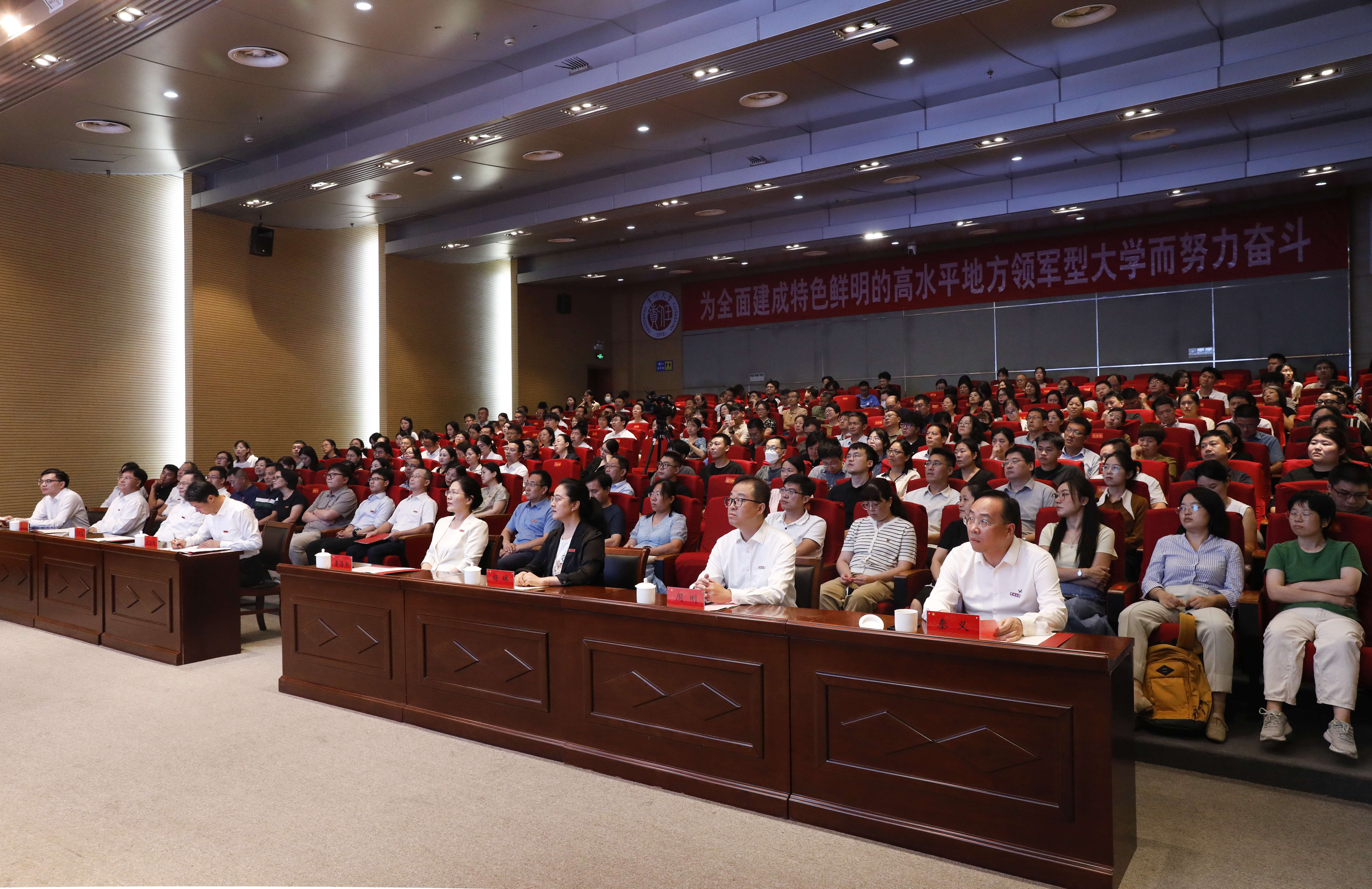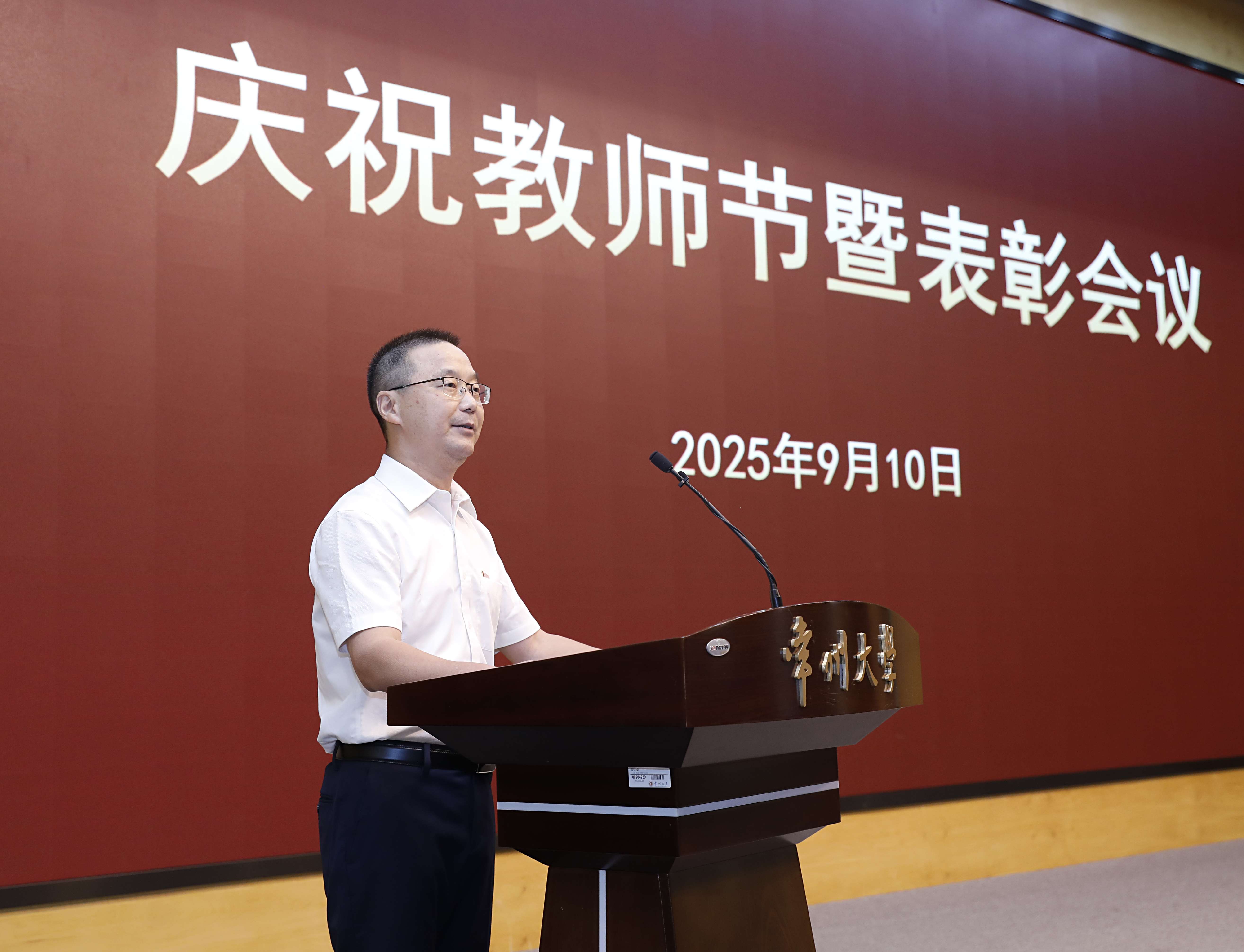 9月10日下午,为庆祝第41个教师节,学校在科教城校区文彰楼报告厅召开庆祝2025年教师节暨表彰会议。会议对2025年获得市厅级以上奖励的集体和个人、第九届“我最喜爱教师”、2024年度常州大学“勤廉标兵”、2024年度常州大学“工人先锋号、五一劳动奖章、五一巾帼标兵岗、五一巾帼标兵”、2025年度常州大学“师德标兵”、2025年度“优秀教育工作者”及从事教育工作满三十年、四十年的教职工进行表彰。党政领导班子成员陈海群、黄海燕、沈新奎、杨琳、李忠玉、周刚、晏成林、秦义、薛冰出席会议。受表彰的先进集体和个人代表,“我最喜爱教师”代表,“勤廉标兵”代表,“工人先锋号、五一劳动奖章、五一巾帼标兵岗、五一巾帼标兵”代表,“师德标兵”代表,“优秀教育工作者”代表,从事教育工作满三十年、四十年的教职工代表,以及相关职能部门负责人和学院师生代表参加会议。党委副书记黄海燕主持会议。
