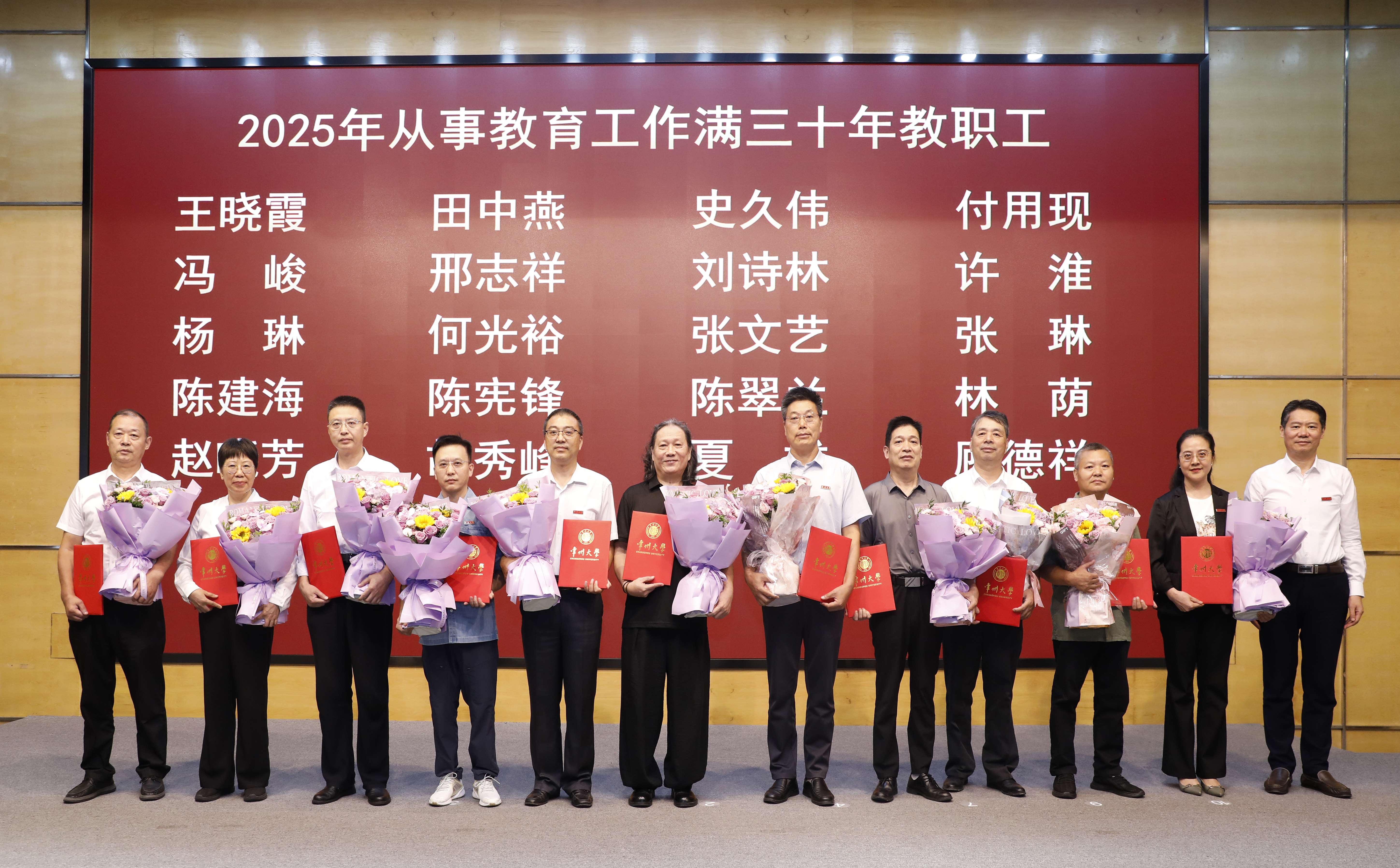党委常委、宣传部部长薛冰宣读了获得市厅级以上奖励名单和第九届“我最喜爱教师”获奖名单,党委常委、组织部部长秦义宣读了获得2024年度常州大学“勤廉标兵”、“工人先锋号、五一劳动奖章、五一巾帼标兵岗、五一巾帼标兵”表彰决定,副校长晏成林宣读了2025年度常州大学“师德标兵”、“优秀教育工作者”表彰决定,党委常委、副校长周刚宣读了从事教育工作满三十年、四十年的教职工名单。党委副书记、校长陈海群,党委常委、纪委书记、派驻监察专员沈新奎,党委常委、副校长杨琳,党委常委、副校长李忠玉为受表彰的教师颁发证书、献上鲜花。