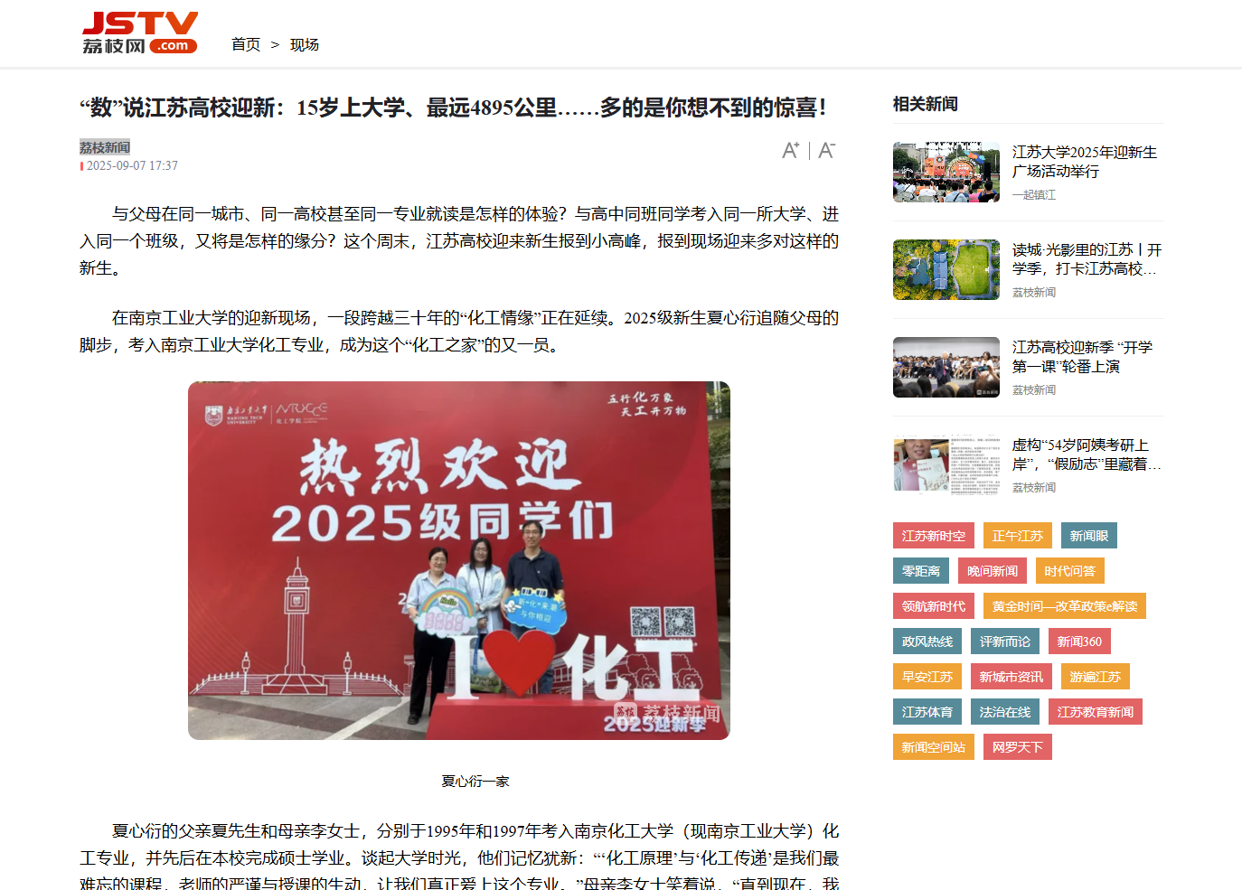 在南京工业大学的迎新现场,一段跨越三十年的“化工情缘”正在延续。2025级新生夏心衍追随父母的脚步,考入南京工业大学化工专业,成为这个“化工之家”的又一员。