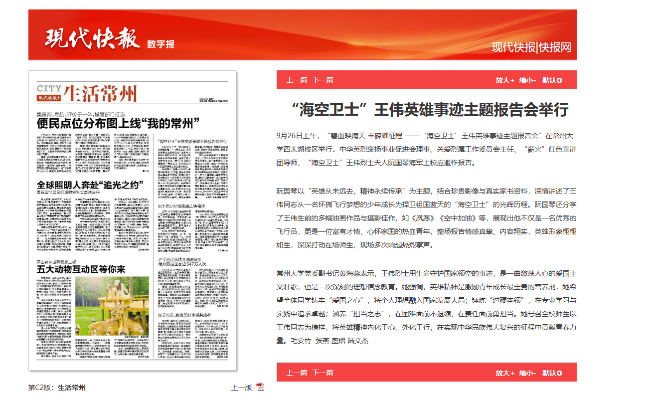 9月26日上午,“碧血映海天 丰碑耀征程 ——‘海空卫士’王伟英雄事迹主题报告会”在常州大学西太湖校区举行。中华英烈褒扬事业促进会理事、关爱烈属工作委员会主任、“薪火”红色宣讲团导师、“海空卫士”王伟烈士夫人阮国琴海军上校应邀作报告。