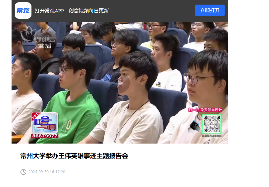 常州电视台:常州大学举办王伟英雄事迹主题报告会