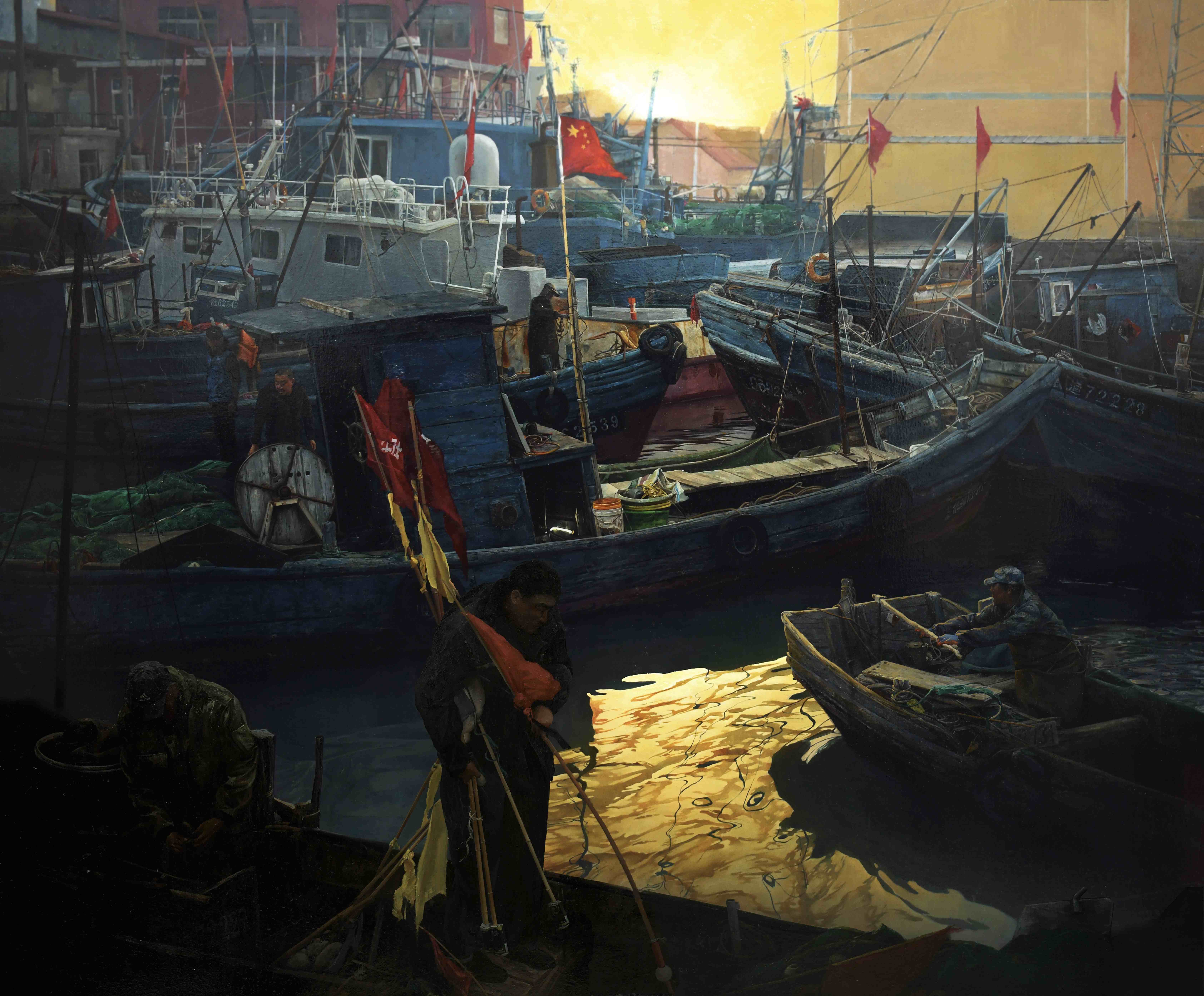 王驰表示,该系列作品以苹果树、果园、果农为创作主体,是我多年来对自然、情感与文化内涵进行深度挖掘与艺术表达的一次实践。《家住幸福地》是2025年夏天新作,这棵老桩苹果树以一种质朴无华的姿态茁壮成长,呈现出清新素雅的气质,彰显着生机与活力,周边的田野与小院房屋在阳光下呈现出金黄色调,散发出质朴的生活情趣。陈帅安表示,油画《启航》以渔业劳作为题材,描绘清晨太阳初升时,渔民们辛勤劳作的场景,展现渔民们在艰苦环境下乐观向上的精神面貌。