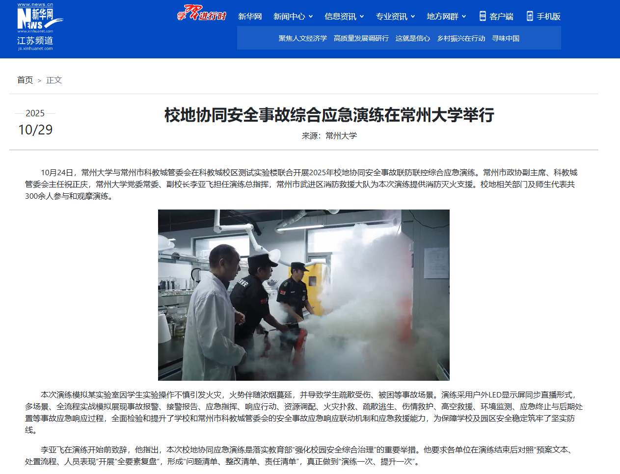 10月24日,常州大学与常州市科教城管委会在科教城校区测试实验楼联合开展2025年校地协同安全事故联防联控综合应急演练。常州市政协副主席、科教城管委会主任祝正庆,常州大学党委常委、副校长李亚飞担任演练总指挥,常州市武进区消防救援大队为本次演练提供消防灭火支援。校地相关部门及师生代表共300余人参与和观摩演练。