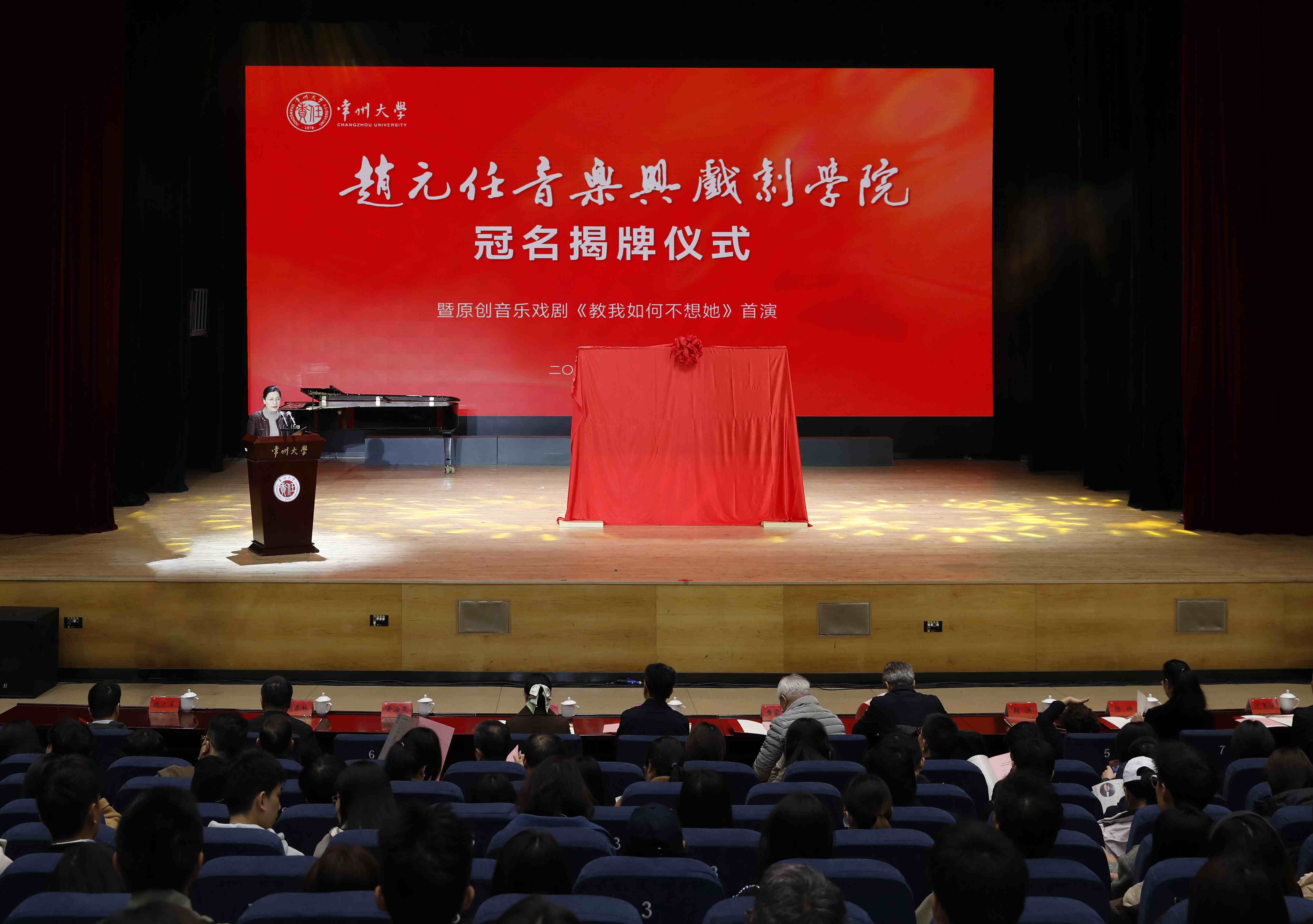 11月22日,赵元任音乐与戏剧学院冠名揭牌仪式暨原创音乐戏剧《教我如何不想她》首演在西太湖校区立艺楼礼堂举行。赵元任先生外孙黄家林教授,常州市委常委、宣传部部长陈志良,江苏省教育厅体育卫生与艺术教育处二级调研员王红蕾,清华大学艺术教育中心主任赵洪,常州市委宣传部副部长谢春林,常州市文学艺术界联合会党组书记、主席沈玉俊,常州市委宣传部办公室主任魏火军,江苏晋陵文旅发展集团有限公司董事长苏刚,内蒙古自治区教育厅美育指导委员会秘书长张卉,上海市学校体育与艺术发展评估中心常务副主任张欢,常州大学党委书记徐守坤,常州大学党委副书记黄海燕,常州大学党委常委、副校长杨琳出席仪式,常州市和武进区相关部门领导、上海音乐学院及省内兄弟院校音乐学院的领导和专家、学校相关职能部门和相关学院负责人、赵元任音乐与戏剧学院全体师生等齐聚一堂,共同见证这一重要时刻。黄海燕主持仪式。