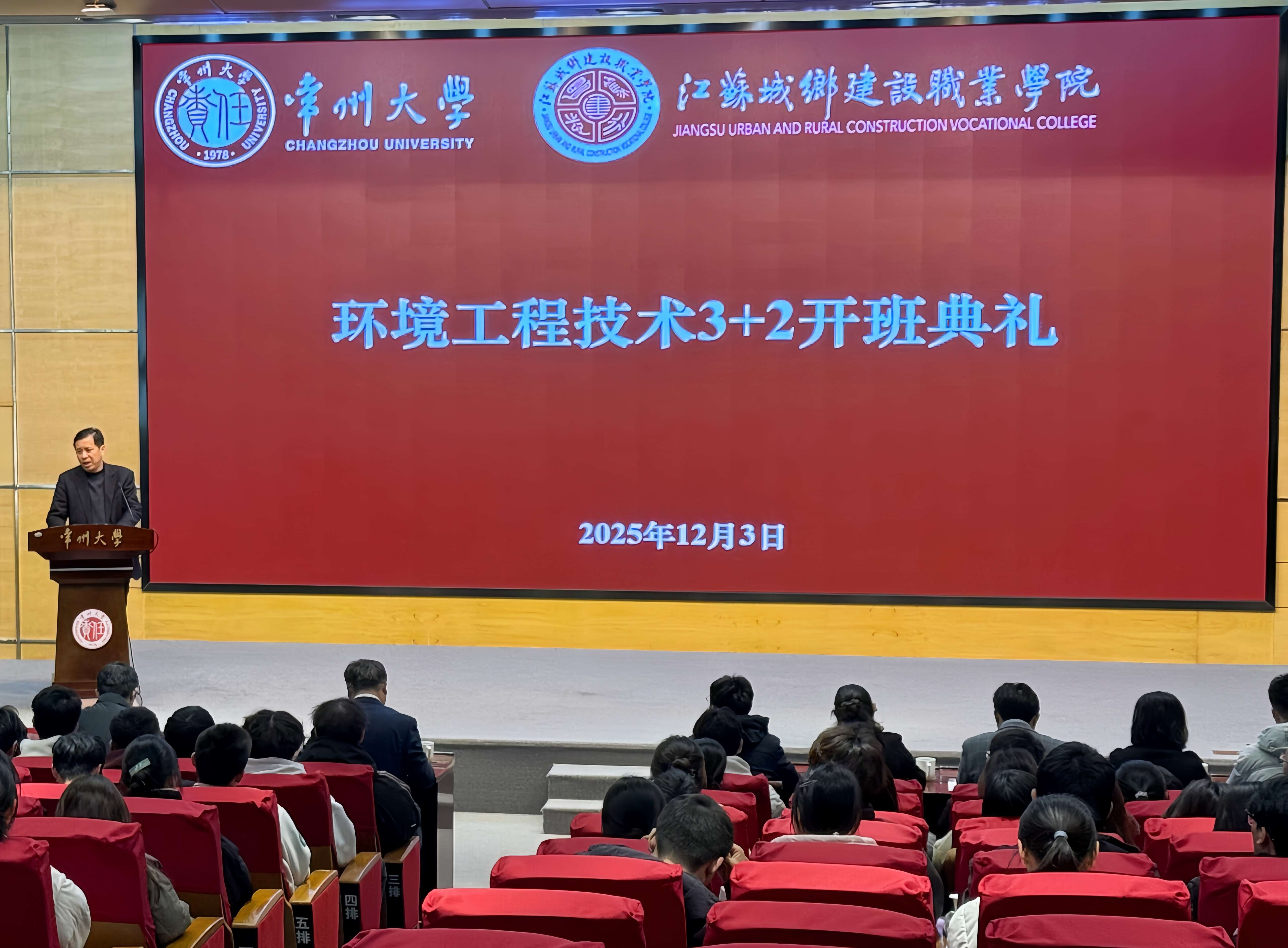 12月3日下午,我校与江苏城乡建设职业学院在科教城校区文彰楼报告厅举行环境工程技术专业“3+2”专本贯通项目开班典礼。我校党委常委、副校长李忠玉,江苏城乡建设职业学院党委委员、副校长袁建刚出席活动,两校相关学院、职能部门负责人、教师代表及江苏城乡建设职业学院环境2301、2401、2501三个班级全体学生共同参加。我校环境科学与工程学院院长马江权主持活动。