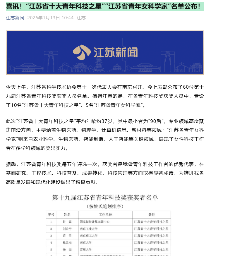 据悉,江苏省青年科技奖每五年评选一次,获奖者是我省青年科技工作者的优秀代表,在基础研究、工程技术、科技普及、成果转化、科技管理等方面取得显著成绩,为推进我省高质量发展和现代化建设做出了积极贡献。
