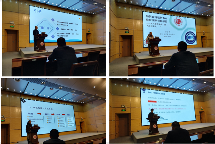 会后,外国语学院周小川、史良法学院余小伟、周有光文学院王静雅、商学院徐益斌等四位青年教师分别作专题讲座,围绕高级别项目申报、持之以恒做学问等主题分享了心得体会与行动策略,为参会教师提供了借鉴和启发。(通讯员/汤滨 审核/彭伟 编辑/温丽馨)