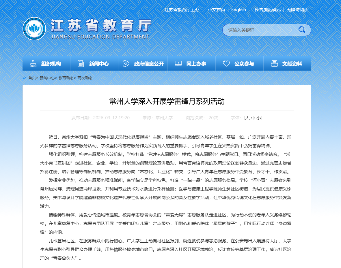 近日,常州大学紧扣“青春为中国式现代化挺膺担当”主题,组织师生志愿者深入城乡社区、基层一线,广泛开展内容丰富、形式多样的学雷锋志愿服务活动。学校坚持将志愿服务作为实践育人的重要抓手,引导青年学生在火热实践中弘扬雷锋精神。