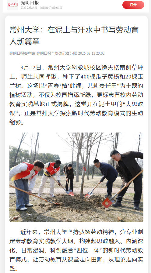 3月12日,常州大学科教城校区逸夫楼南侧草坪上,师生共同挥锹,种下了400棵瓜子黄杨和20棵玉兰树。这场以“青春‘植’此绿,共耕责任田”为主题的植树活动,不仅为校园增添新绿,更标志着校内劳动教育实践基地正式揭牌。这堂开在泥土里的“大思政课”,正是常州大学探索新时代劳动教育模式的生动缩影。