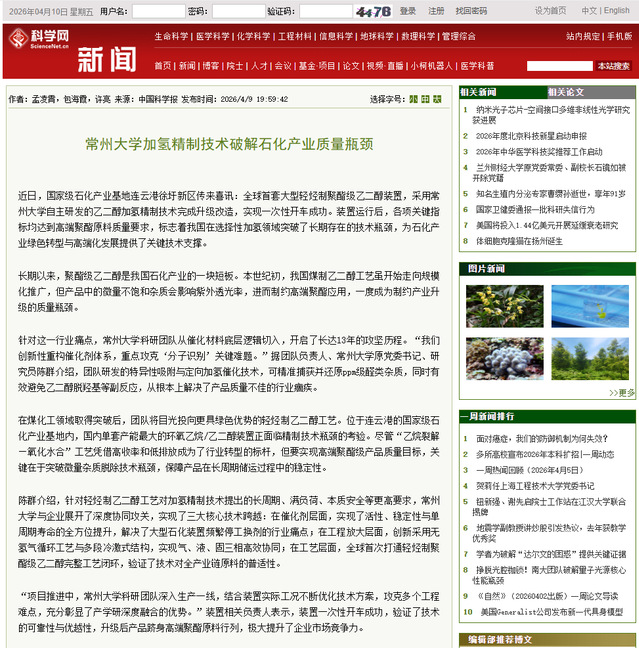 近日,国家级石化产业基地连云港徐圩新区传来喜讯:全球首套大型轻烃制聚酯级乙二醇装置,采用常州大学自主研发的乙二醇加氢精制技术完成升级改造,实现一次性开车成功。装置运行后,各项关键指标均达到高端聚酯原料质量要求,标志着我国在选择性加氢领域突破了长期存在的技术瓶颈,为石化产业绿色转型与高端化发展提供了关键技术支撑。