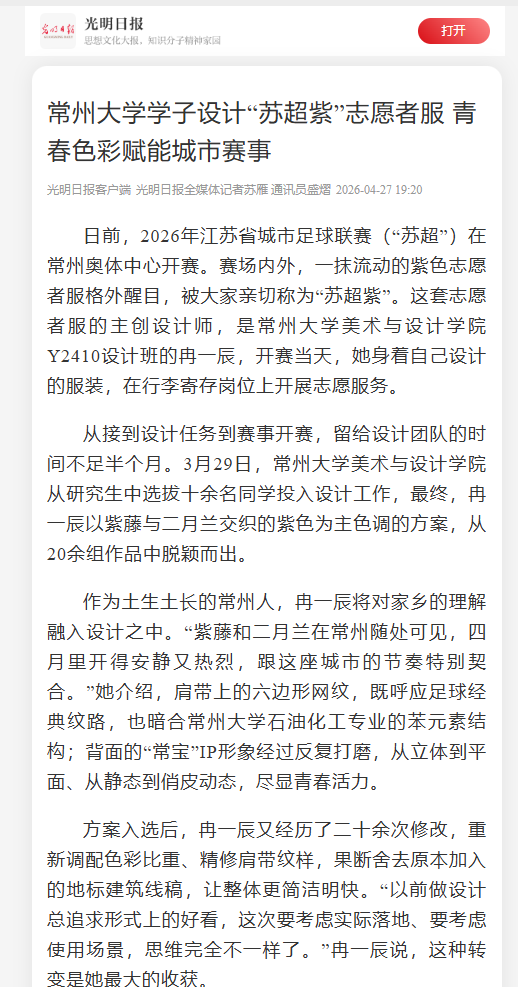 日前,2026年江苏省城市足球联赛(“苏超”)在常州奥体中心开赛。赛场内外,一抹流动的紫色志愿者服格外醒目,被大家亲切称为“苏超紫”。这套志愿者服的主创设计师,是常州大学美术与设计学院Y2410设计班的冉一辰,开赛当天,她身着自己设计的服装,在行李寄存岗位上开展志愿服务。