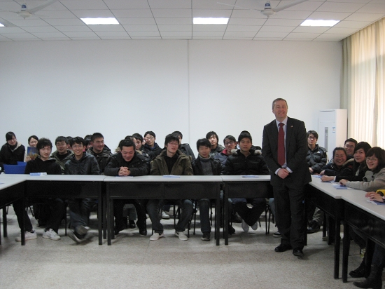 下午代表团与国际学院全体行政人员和中爱班学生分别进行座谈,就国际学生的管理以及即将进入爱尔兰的中爱06学生的各方面问题进行交流探讨。同学们对国际学生的管理、学习、生活及就业等多个方面踊跃提问,爱