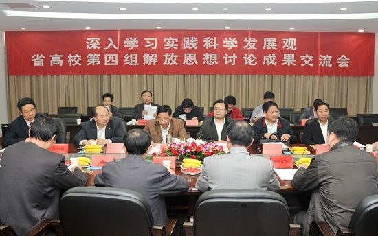 我校党委书记、校深入学习实践科学发展观活动领导小组组长王雪峰首先作交流汇报。王书记对第四组高校负责人到我校进行交流指导表示了热烈欢迎,他就我校深入学习实践科学发展观活动谈了“一点体会”,总结了“三点收获”。他指出,我校的学习实践活动是以反思的基本态度来对待的,我校通过多种形式开展学习实践活动,广大师生员工进一步解放思想、积极主动地投入到学习实践活动中,为学校的发展献计献策。在我校“推进科学发展,建设教学研究型大学”的学习实践活动主题下,学校上下形成了“以人为本”为根本,“特色强校”为关键,“服务地方”为体现的基本共识,这也正是我校的学习实践活动的“三点收获”。