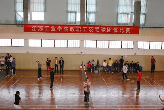 2009年江苏工业学院教职工羽毛球混合团体赛于4月25日在白云校区体育馆举行,来自十四个分工会的代表队参加了为期一天的紧张比赛。比赛场面精彩,场上频频传来观众们的喝彩声。 经过小组循环赛、半决赛和决赛的激烈角逐,比赛取得圆满成功,最后,机关分工会、信息学院分工会、化工学院分工会、数理学院分工会分获前四名,机械学院分工会、外国语学院分工会、怀德学院分工会、经管学院分工会并列第五名。