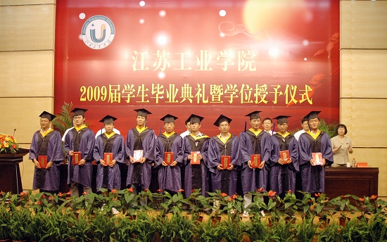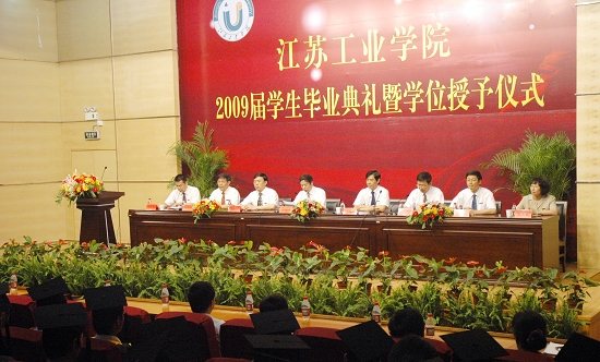 毕业典礼暨学位授予仪式在雄壮的国歌声中开始。校党委书记王雪峰教授宣读了“江苏工业学院学位评定委员会关于授予研究生硕士学位的决定”、“关于表彰2009届优秀毕业研究生的决定”和“关于表彰2009届优秀硕士论文的决定”。校领导为优秀毕业研究生、优秀硕士论文获得者颁发了荣誉证书。接着校学位委员会主席、党委副书记、校长陈志刚教授在悦耳动听的喜洋洋乐曲声中一一为毕业研究生授予了学位。