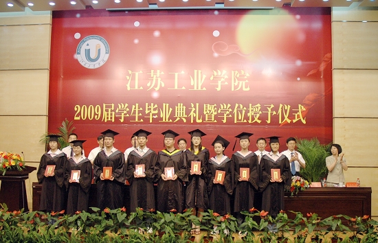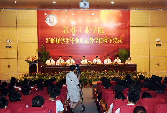 6月24日下午,我校2009届本科生毕业典礼暨学士学位授予仪式在武进校区文彰楼报告厅隆重举行。校领导王雪峰、陈志刚、左健民、孙小强、王凯全、蒋必彪、陈奎庆、王卫星出席典礼。各二级学院院长、部分职能部门负责人、2009届毕业生代表和学生家长代表300余人参加了典礼。