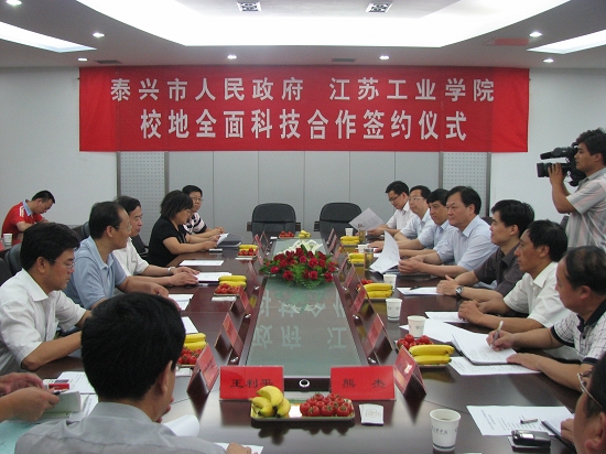 6月26日下午2:00,在我校第二会议室举行了泰兴市人民政府-江苏工业学院校地全面科技合作签约仪式。泰兴市人民政府市委副书记、市长高亚梓,泰兴市委常委、市政府副市长王越,泰兴市政府副市长杨晋安及泰兴市开发区管委会、泰兴市人事局、泰兴市科技局、泰兴市政府办、江苏中丹化工集团公司、江苏河海纳米科技股份有限公司相关负责人;我校党委书记王雪峰,副校长陈奎庆,副校长丁建宁及相关部门负责人出席了校地全面科技合作签约仪式。会议由丁建宁副校长主持。