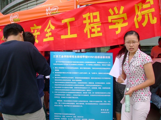 今年新生报到正赶上甲型H1N1流感流行,鉴于新生报到时人员密集的特点,为有效地预防和控制甲型H1N1流感疫情,做好迎新工作,学校采取相应的防控措施,在报到现场对来校报到新生以及陪同家长逐一进行体温检测,并做好记录。同时,研究生部也通过展板的形式对新生进行防治甲型HINI流感知识的宣传。在当天的新生报到中没有发现一例体温异常学生。