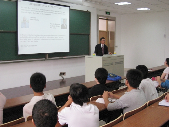 下午, 平建路教授为我校师生做了一场题为“美国大学教育与阿拉斯加大学介绍”的精彩报告,系统而全面的介绍了美国阿拉斯加大学,并与同学们就阿大留学政策等方面进行了探讨。