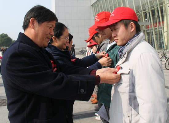 王凯全副书记,以及学生处、团委、后管处、后勤集团、宣传部负责人为志愿者佩戴红丝带