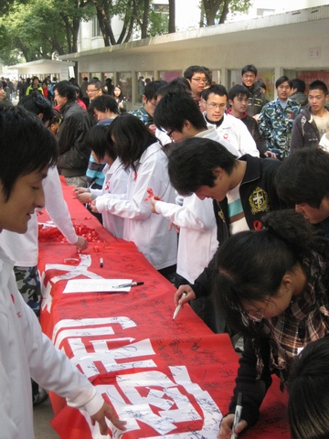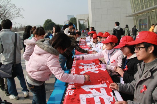 12月1日中午,我校在武进校区食堂广场和白云校区大学生活动中心同时举行宣传周启动仪式暨大型签名活动,3000多名师生在写有“遏制艾滋,履行承诺”的横幅上郑重签名。在两校区活动现场,医保中心工作人员和我校红丝带志愿者还向师生发放了千余份宣传资料。校党委副书记王凯全在武进校区出席活动并讲话;学生处、团委、后管处、后勤集团、宣传部负责人参加启动仪式并为志愿者佩戴红丝带。
