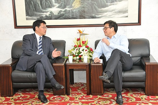 座谈会前,浦玉忠校长在贵宾接待室与王志新院士亲切会面,并就科研课题申报及科研梯队建设进行了深入探讨。