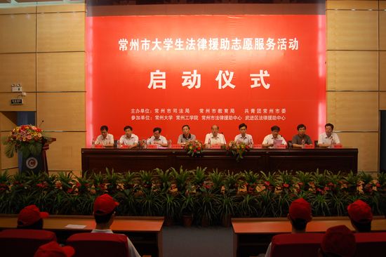 6月26日上午,由常州市司法局、市教育局、共青团常州市委、常州大学团委共同组织的以“宣传法律援助制度,维护困难群众合法权益”为主题的常州市大学生法律援助志愿服务活动启动仪式在常州大学举行,常州市人大常委会副主任陆洪生,市政协副主席赵敖祥,市司法局局长任新华,常州大学党委副书记、纪委书记王凯全等领导出席启动仪式,我校团委大学生法律援助中心、法管学院和环境学院近300名大学生法律援助志愿者参与了启动仪式。启动仪式由市司法局局长任新华主持。常州电视台、现代快报、江苏法制网、中国常州网等多家媒体对此给予报道。