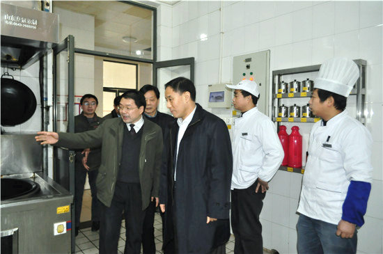 省教育厅安保处副处长张虎成、省烹饪协会常务副秘书长彭东生共同为我校 “7S精益管理示范食堂”授牌。
