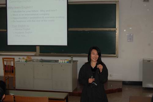 剑桥商务英语证书考试是由英国剑桥大学考试委员会认证的,是从商务角度出发,包括对阅读,听力,写作,口语四个部分的英语综合能力考察的一种考试。BEC每年举办两次,在世界范围内被众多知名企业和机构认可。孙久荣老师本人既是资深培训官,同时也是BEC口试考官。讲座过程中,孙老师分别从考试类型、考试特点以及考试准备等方面详细地介绍了BEC考试的有关事项。她指出BEC证书对英语专业学生的重要性,并强调勤奋和坚持是获得成功的重要因素。