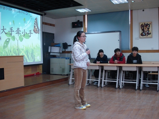 3月23日下午,怀德学院大学生心理自助中心成员受邀走进常州市白云小学,开展了以“大手牵小手”为题的心理健康教育活动。活动中,心理自助中心的成员带领小学生们一起做了心理游戏,气氛非常活跃。自助中心还播放了“让生命充满爱”的演讲视频,并由心理自助中心主席张小松对视频进行了讲解,小学生们被深深触动,踊跃举手发言,纷纷表示要为努力读书,长大为祖国做贡献。