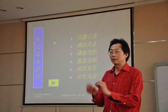 张桂舟老师讲授了服务礼仪在图书馆工作中的重要意义,并从仪容规范、仪表规范等几个方面系统全面地阐述了在工作和生活中应该掌握的礼节,他将理论与实际相结合,事例生动具体,语言诙谐幽默,让全馆职工在学习中获得快乐,在学习中提高修养。
