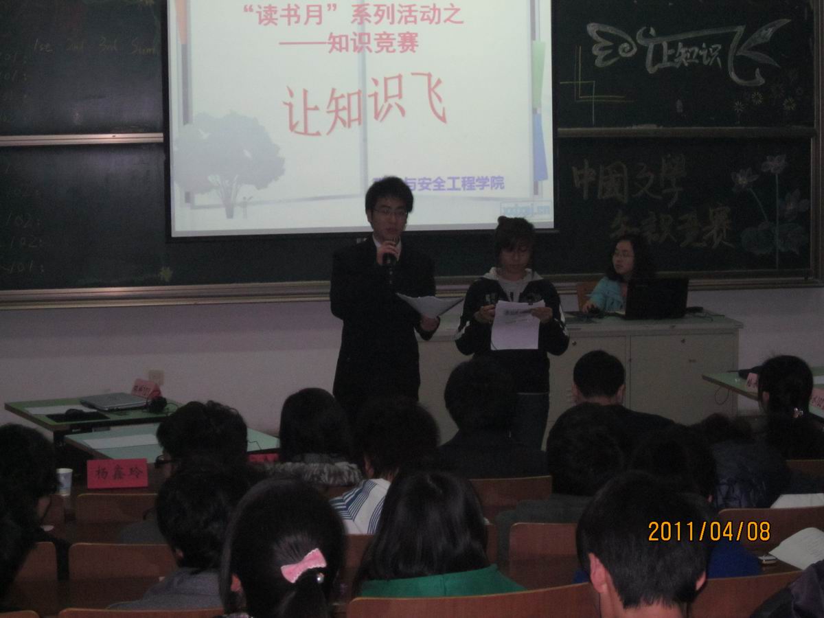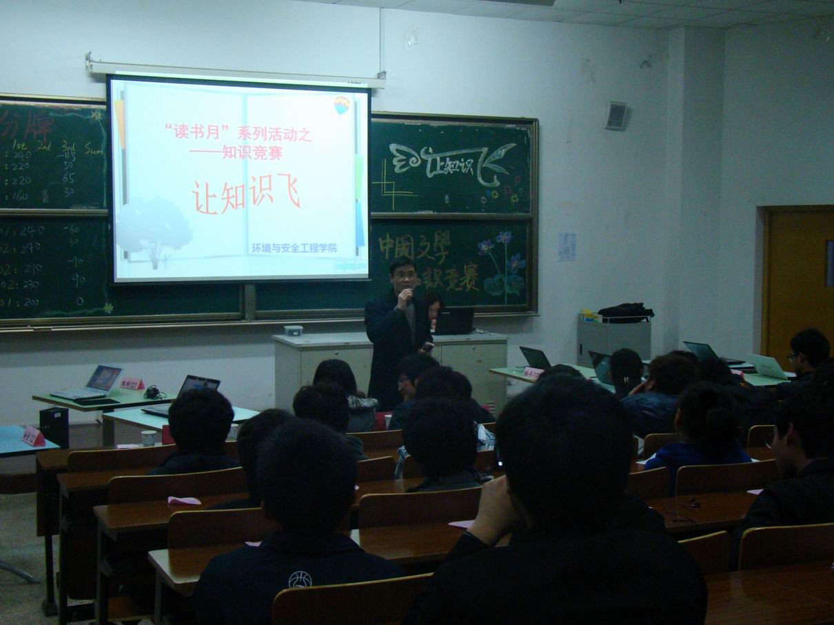 为增进学生对中国文学的了解,品味中国经典文化,丰富学习生活,4月8日晚,环境与安全工程学院自律中心在W7阶举办了“读书月”系列活动之知识竞赛——“让知识飞”。环境学院学工办老师、学生会、团委负责人应邀出席本次活动。