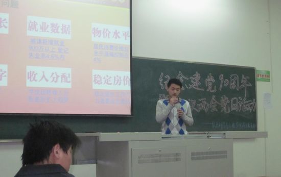 一段关于党的历史纪录片,把大家带到了建党之初的峥嵘岁月中,大家仿佛亲眼见证了中国共产党由星星之火变成燎原之势,最终建立了新中国的艰辛历程。同时,也看到了在党的领导下社会主义现代化建设取得的伟大成就。接着,主持人简单扼要的向大家介绍了有关今年两会的热点问题,各个班级学生党员代表畅谈对两会热点话题的看法。最后,全体学生党员共同宣读党员创先争优承诺书结束了此次党日活动。