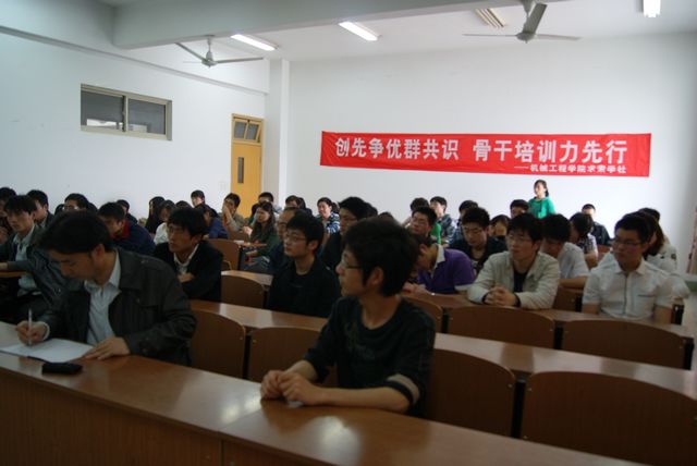 4月15日下午,由机械工程学院党委主办,求索学社承办的“在哲学视域中创先争优” 骨干培训讲座在白云校区S408隆重召开,校党委组织部部长周兰珍应邀为学院师生做讲座。院党委副书记吴荷平、学工办相关老师、院学生党支部党员代表、部分学生干部参加了此次讲座。
