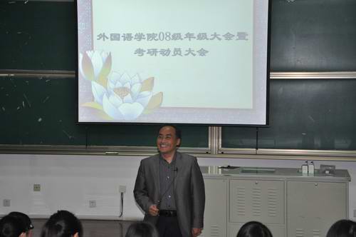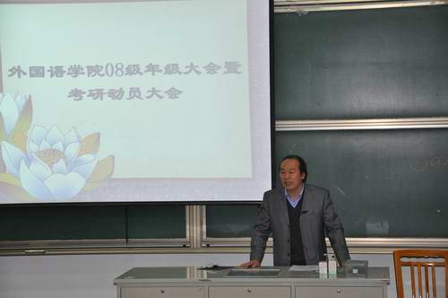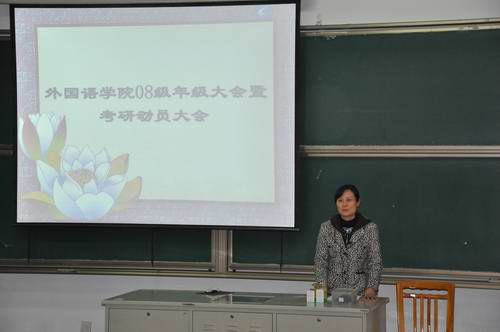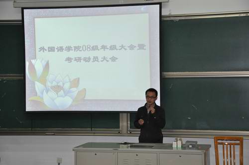 谢章丽副书记指出,08级的同学即将进入大学四年级,面临着一个人生重要的转折点,是就业、考研,还是出国留学。希望同学们能够根据自身的情况合理做好学业规划,早做打算,早做准备;薛荣院长就考研目标、信息收集和专业选择等几个方面做了系统、深入的解读;外国语学院优秀青年教师陈磊就考研的相关准备工作做了详细的介绍;今年考取苏州大学硕士研究生的陆思琦同学为在场的同学做经验交流,介绍考研心得;准备参加2012年考研的08级俞婧同学在会上做了考研表态。黄正书记以自身丰富的的人生经历为例向08级全体同学记作了精彩的考研总动员,号召同学们应该为了明天的美好生活而努力学习。