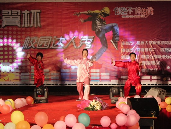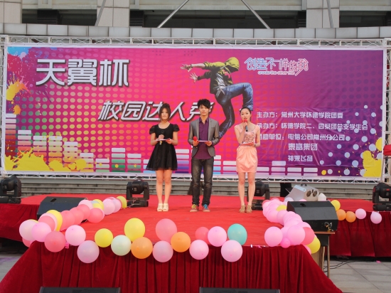4月22日晚,由怀德学院团委主办、二系、四系团总支学生会承办的怀德学院首届校园达人秀决赛在白云校区南区广场隆重举行。本次总决赛特邀常州天皇堂弄社区党委书记刘林、常州电台万峰热线记者黄苏担任专业评委,26名学生担任大众评委,怀德学院副书记、副院长陆恒、学工办主任、团委书记、各系辅导员以及现场近500名观众观看了此次决赛。
