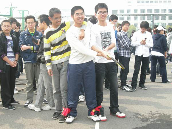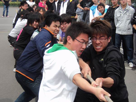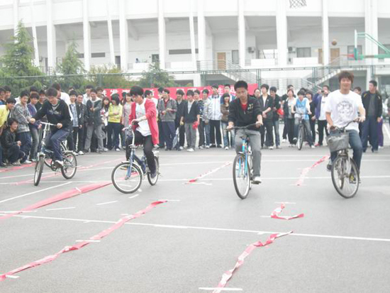 本次趣味运动会由三人四足行、趣味接力赛、自行车慢骑、拔河比赛等多个项目组成。同学们早早的来到了运动场为比赛做准备,每一场比赛大家都认真对待,全力以赴,展现同学们的青春活力与风采。三人四足考验了同学们的身体协调能力,体现了彼此间的默契程度,在磨合了一段时间之后都有良好的发挥和优异的表现。趣味接力由网球拍托篮球、乒乓球拍托网球、跳绳跑50米三个分项目组成。比赛要求同学们在跑步的同时保持好拍子上球的平衡,不让它掉下来。速度和平稳的权衡是这项比赛的一个亮点。在长15米,宽2米的赛道上自行车慢骑也是一个不小的挑战。有两位身体平衡能力优异的同学甚至把车骑到了给人静止感觉的境界。本次运动会中的重头戏为拔河比赛。每组由15名男生和5名女生组成。轻松的气氛在拔河准备时变得十分紧张,参赛同学各个摩拳擦掌,每组都自信满满。哨声是比赛开始的信号,此起彼伏的加油声、绷紧颤抖的长绳、咬紧牙关的面孔、持续有力的口号……比赛,胜负总是有的,但是比赛所体现的友情和团结精神则更加宝贵。