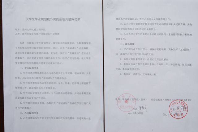 据悉,龙城讲坛是覆盖常州市的社会性、标志性、公益性、普及性的公共文化品牌项目。此次签署协议合作项目是在前两次学院参加龙城讲坛程社明教授“人生发展与职业生涯规划”与陈光标先生的“人生价值观与财富观” 讲座基础上的进一步深化,也是学院学业规划和导学活动的进一步拓展。