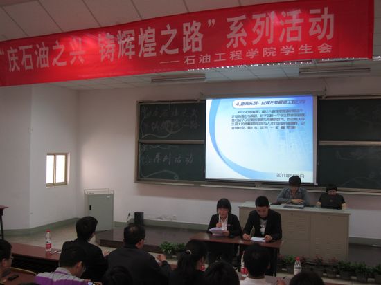 近日,“庆石油之兴,铸辉煌之路”庆学院成立学生系列活动之风采展示于白云校区南6阶进行,学院党委副书记陈粲出席活动,学工办老师担任评委,09、10年全部班级参与了活动。
