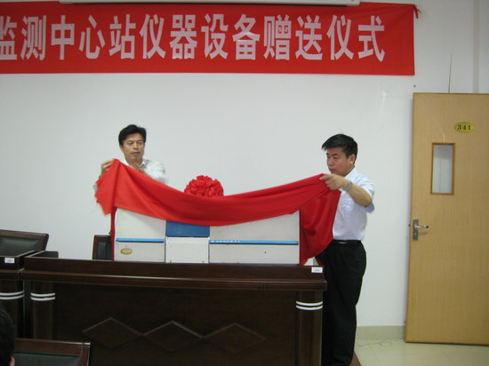 常州环境监测中心主任蔡焕兴和常州大学资产与实验室管理处处长袁惠新为捐赠仪器揭幕
